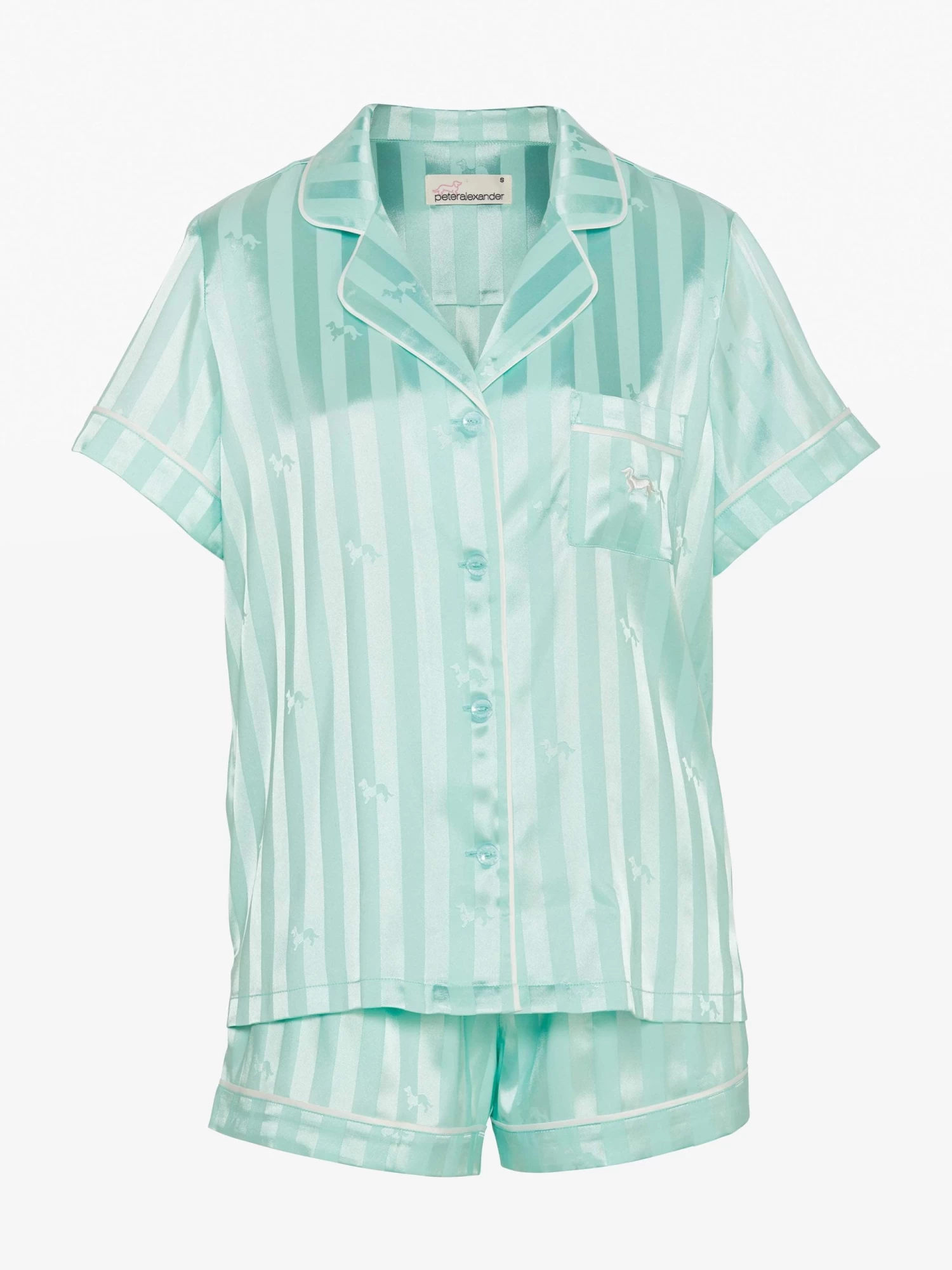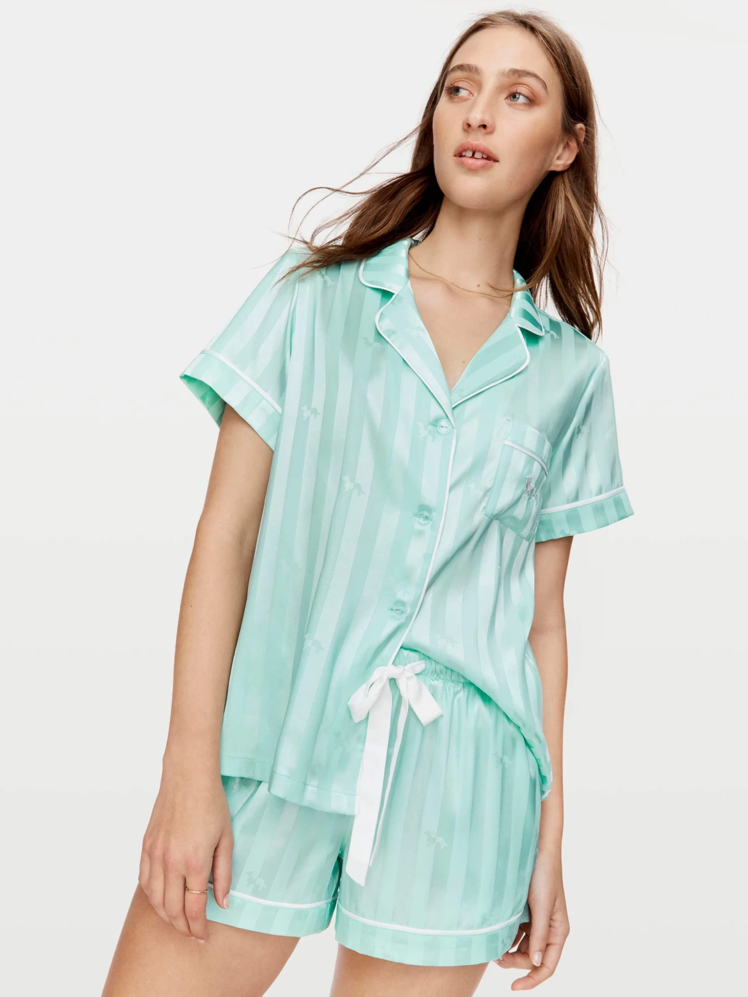 Our ever popular signature style satin pyjama set for women is now available in this new aqua shade that is the prettiest pop of colour with a soft stripe penny effect.