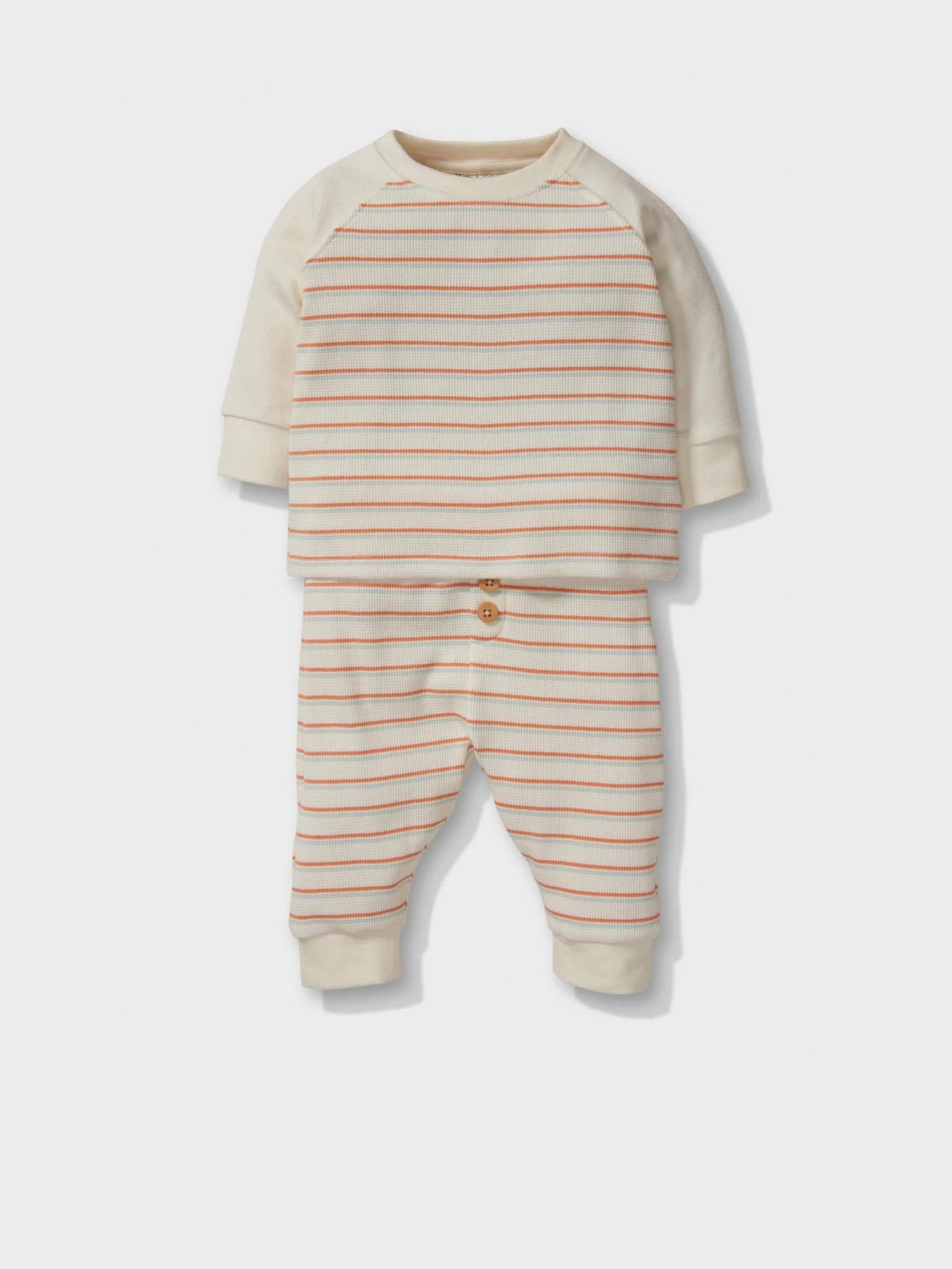 Stripe up bub’s life with this two piece baby PJ set. Made with 95% soft organic in-conversion cotton and blended with 5% elastane to ensure you stay comfy and breathable throughout the night. Organic in-conversion cotton refers to products certified organic by the Global Organic Textile Standard (GOTS) as being made with cotton grown on land converting from ‘conventional’ to organic practices. This approach supports more farms on their journey to organic farming. From organic cotton in-conversion to organic dyes free from nasties, we have kept the process pure and simple.
