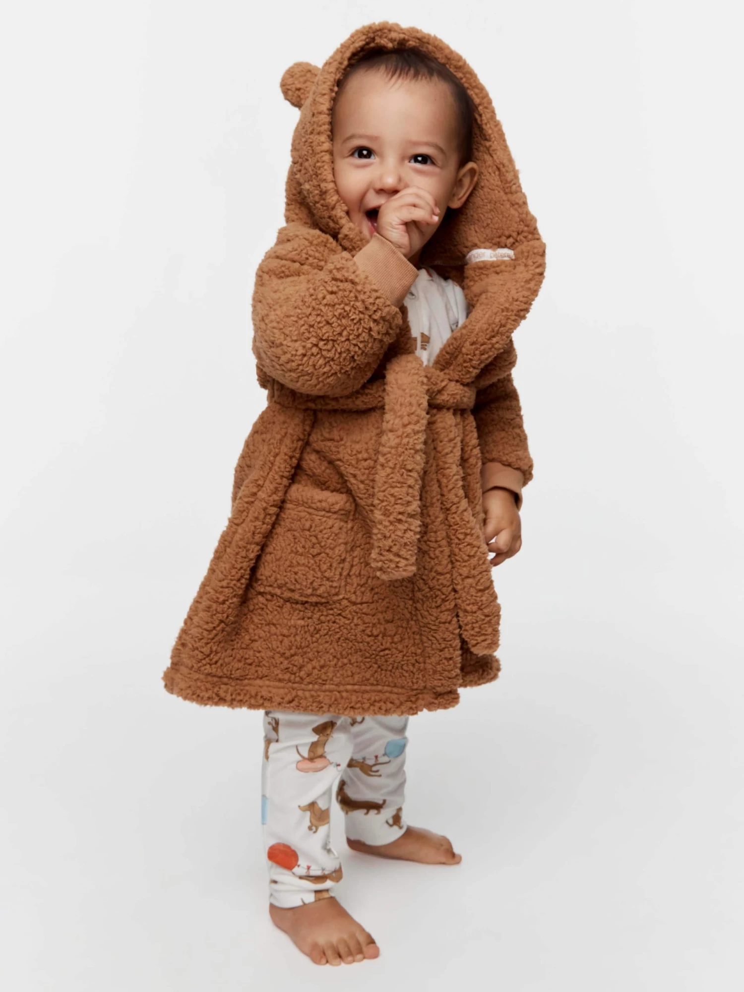 Keep your little one super cosy and look bear-y cute in this gown for babies. Feautring bear ears on the hood, front pockets and a removable tie belt.