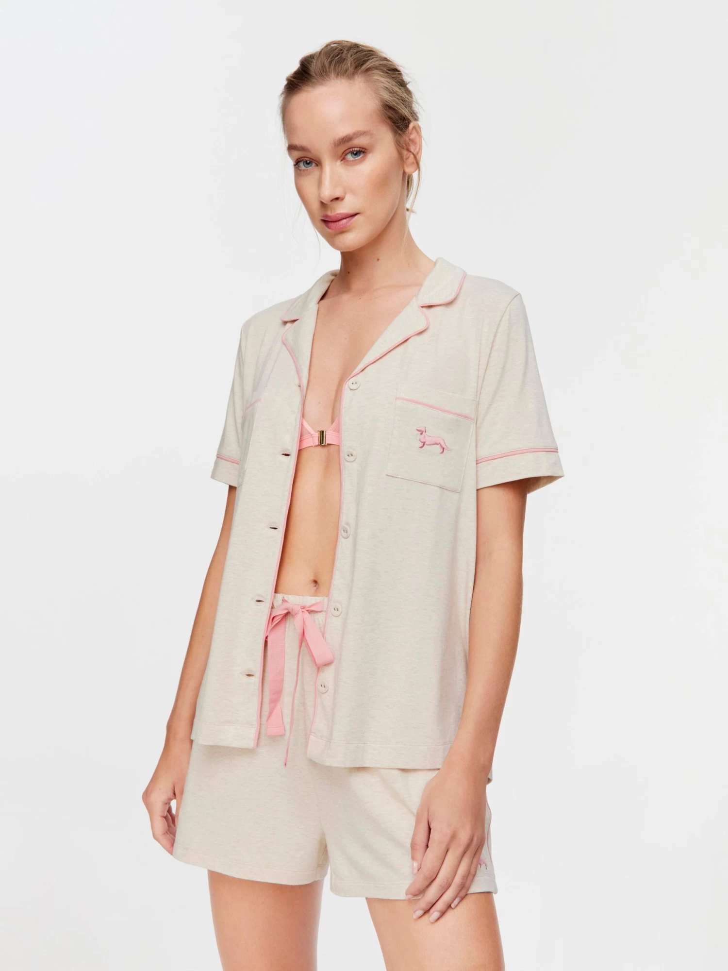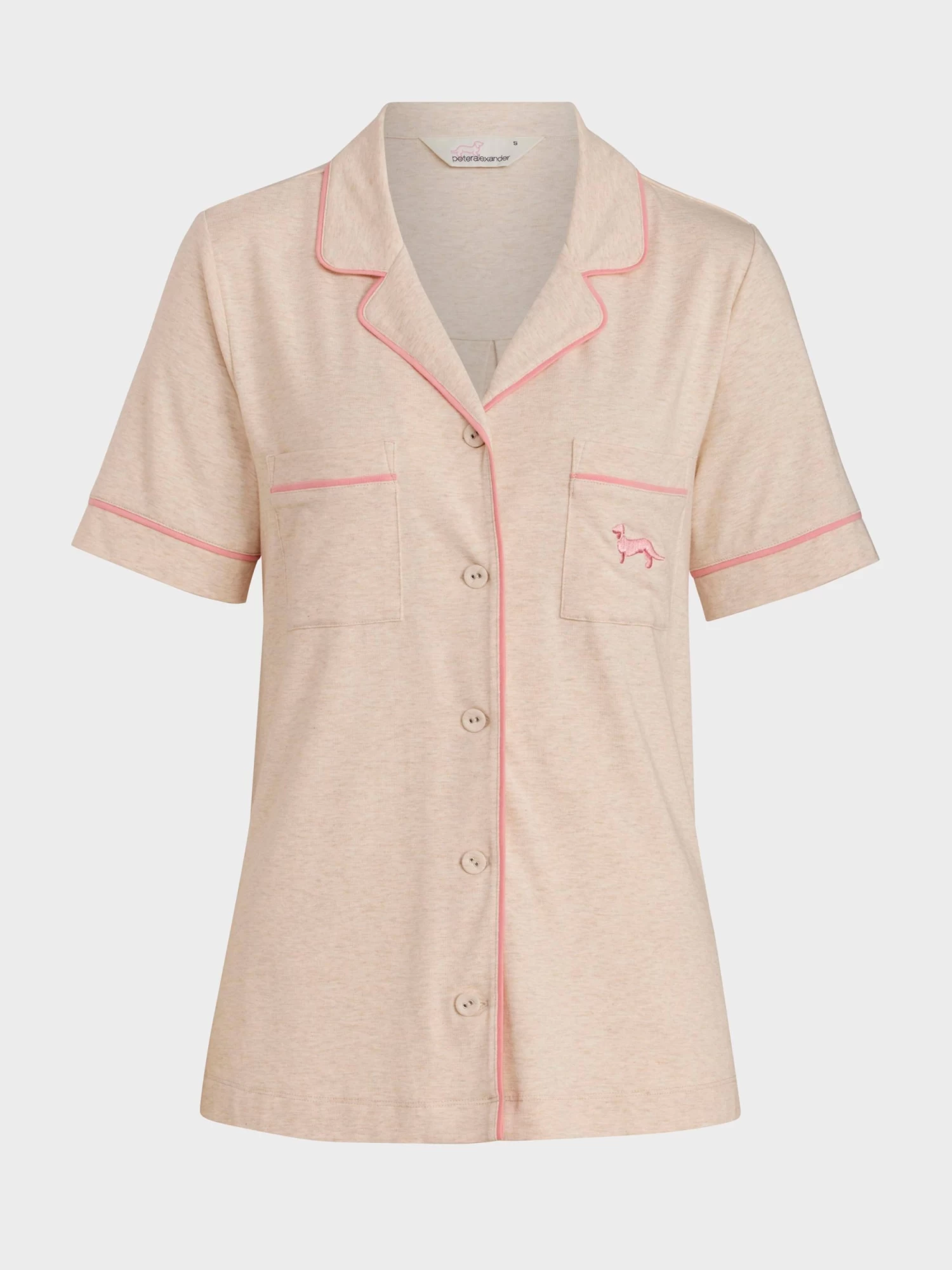 Keep it classic with this ultra soft bamboo short sleeved shirt, in a caramel tone with pink trims. Be sure to pair with the matching PJ shorts and pants for the perfect set.