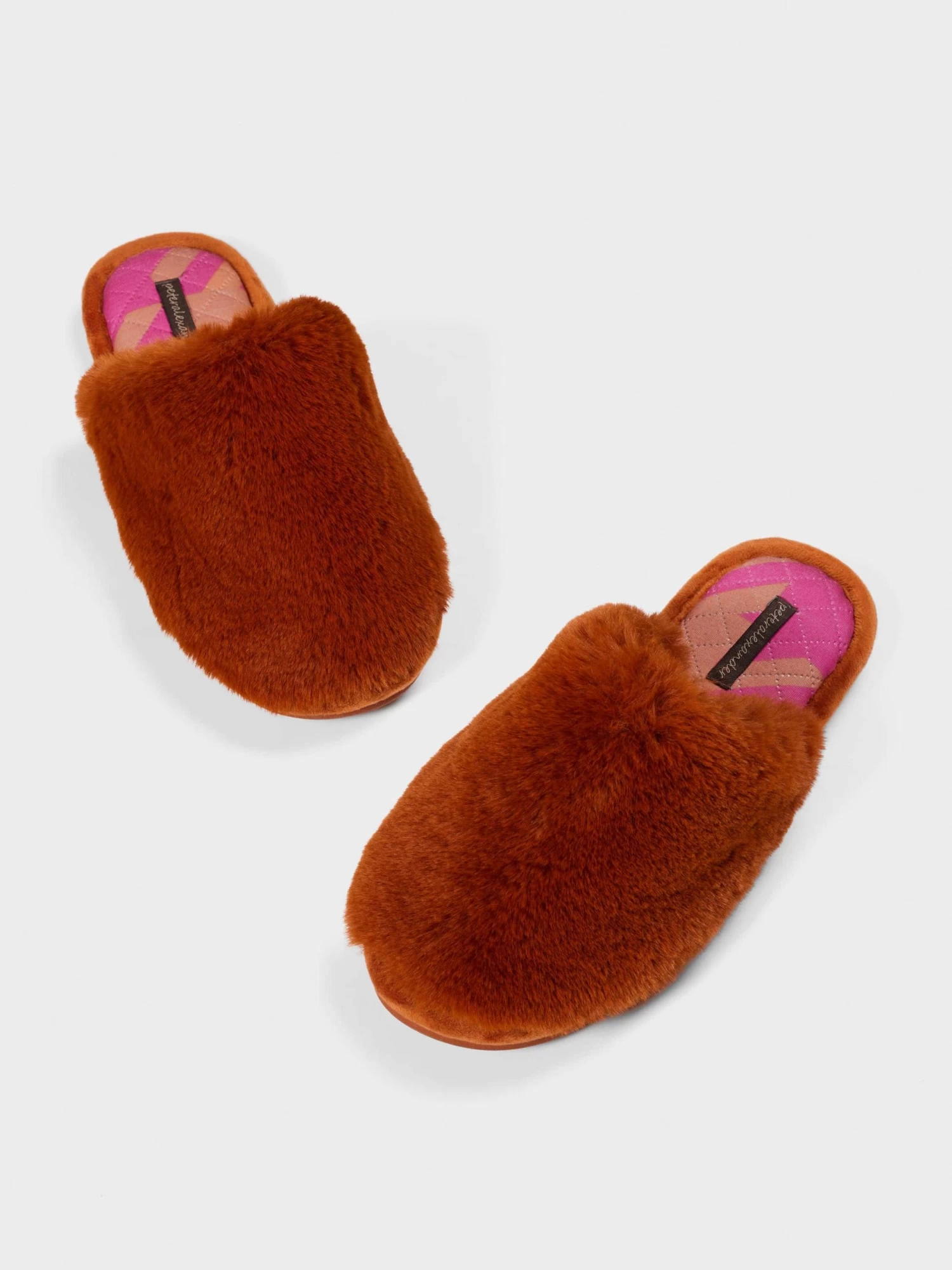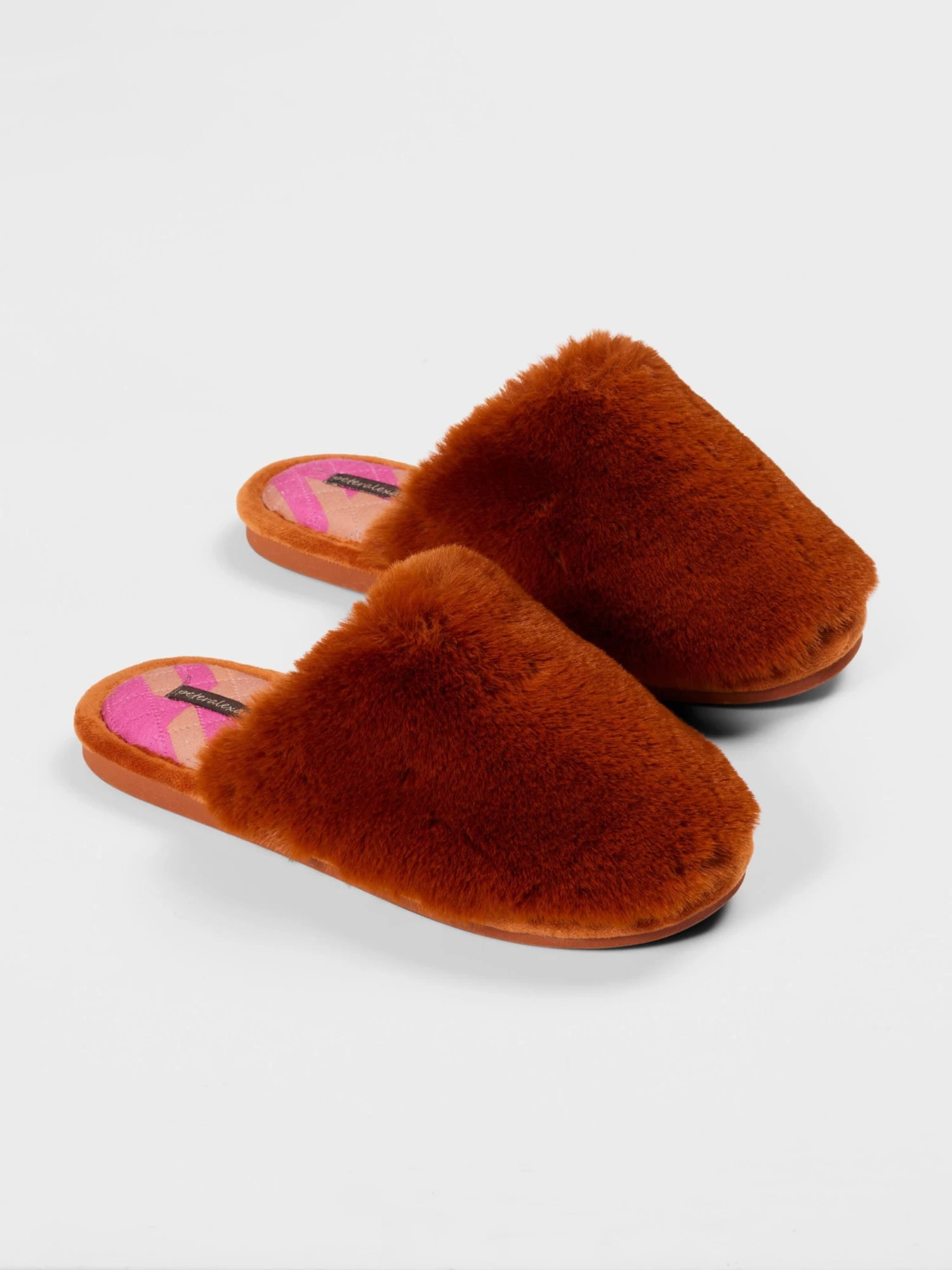 Cosy and cute, these furry women’s scuffs are a comfy caramel delight. Wear all winter long to feel toes-ty warm.