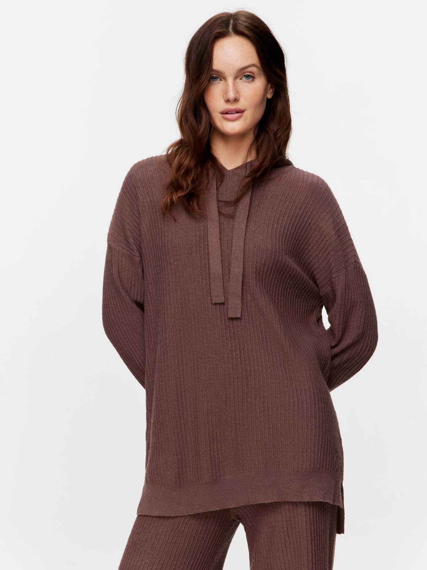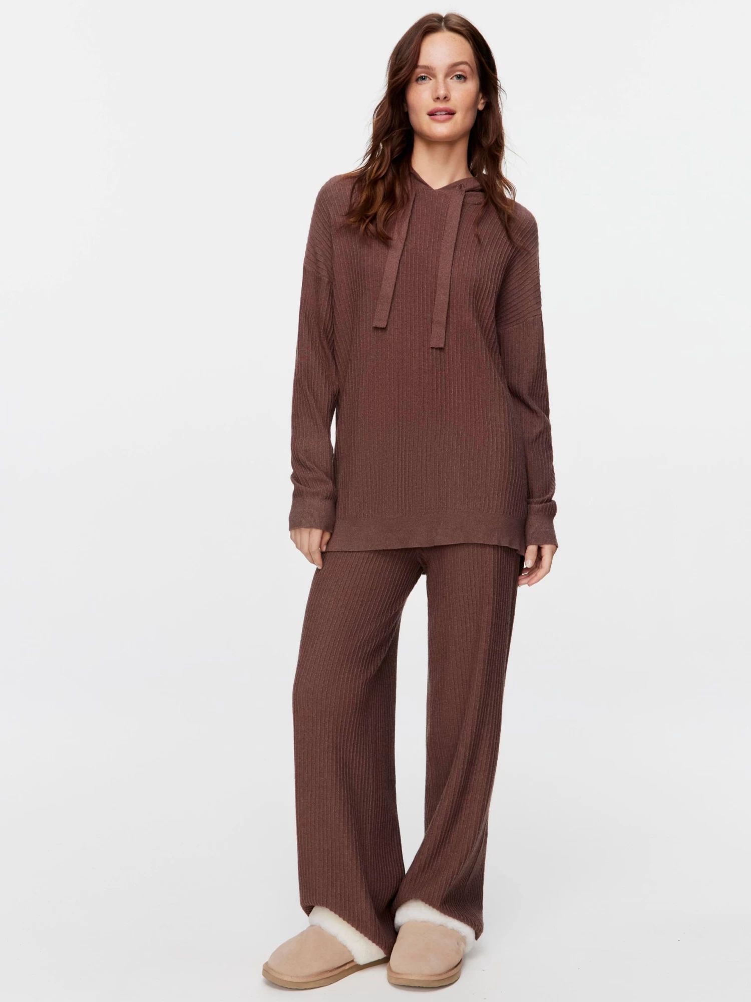 Brown doesn’t have to mean basic this winter. This trendy women’s ribbed hoodie will pair best with the matching wide-leg pants.