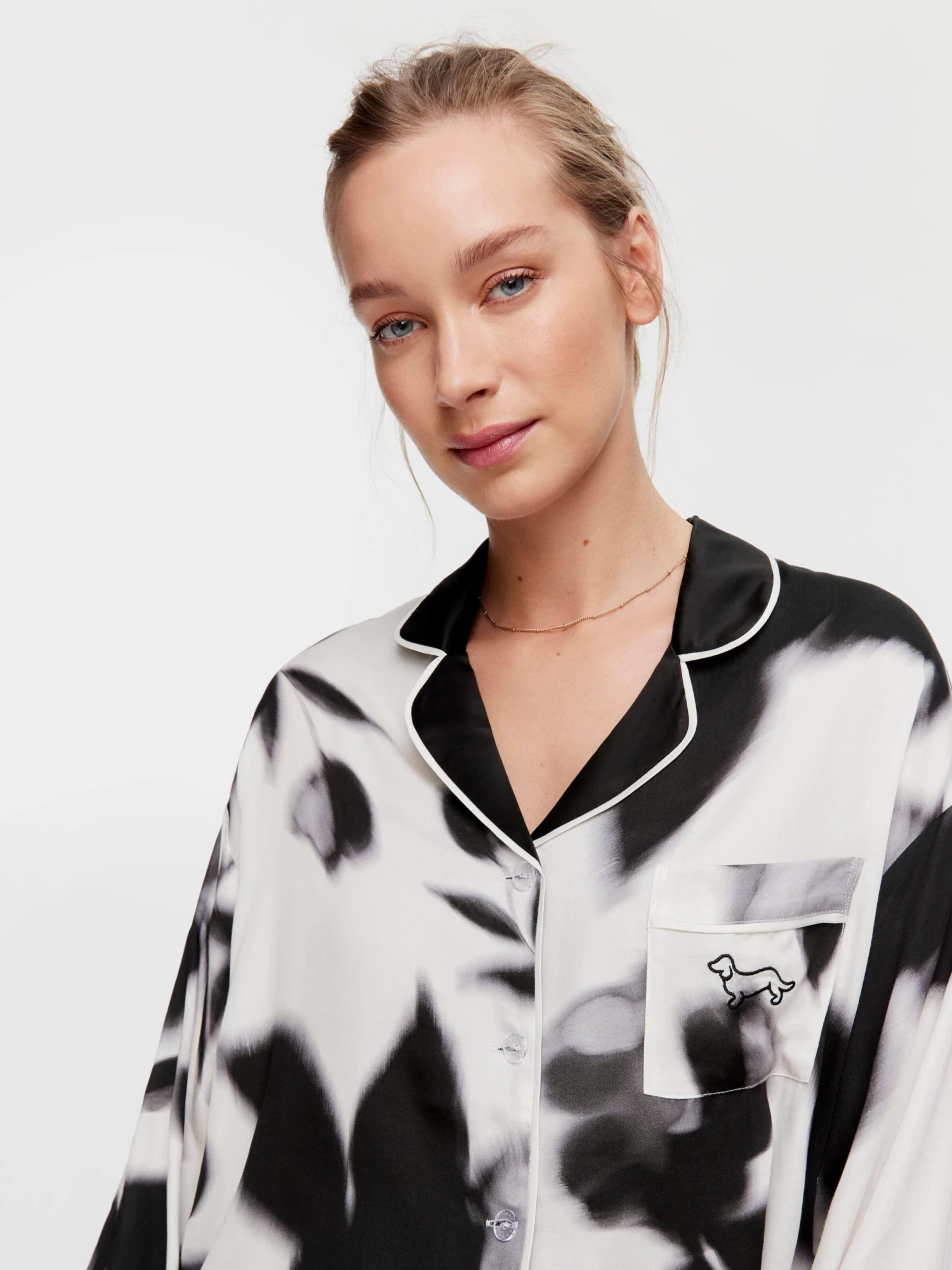 Have a monochrome moment in this stunning black and white pyjama set, featuring a long sleeve collared shirt and matching wide leg PJ pants. In a luxurious floral print on a unique fashion style to help you stand out and look chic every night!