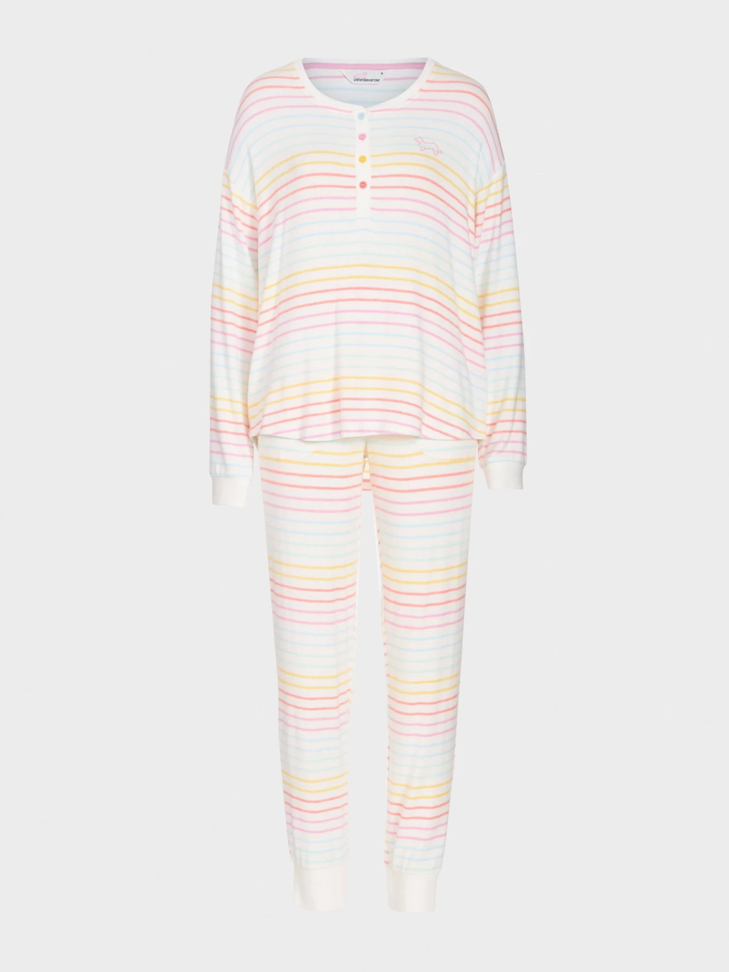Brighten your night with this fuzzy rainbow stripe PJ set. Featuring a comfy long sleeve with a henley neckline, and matching easy PJ pants to keep you cosy through the cooler months.