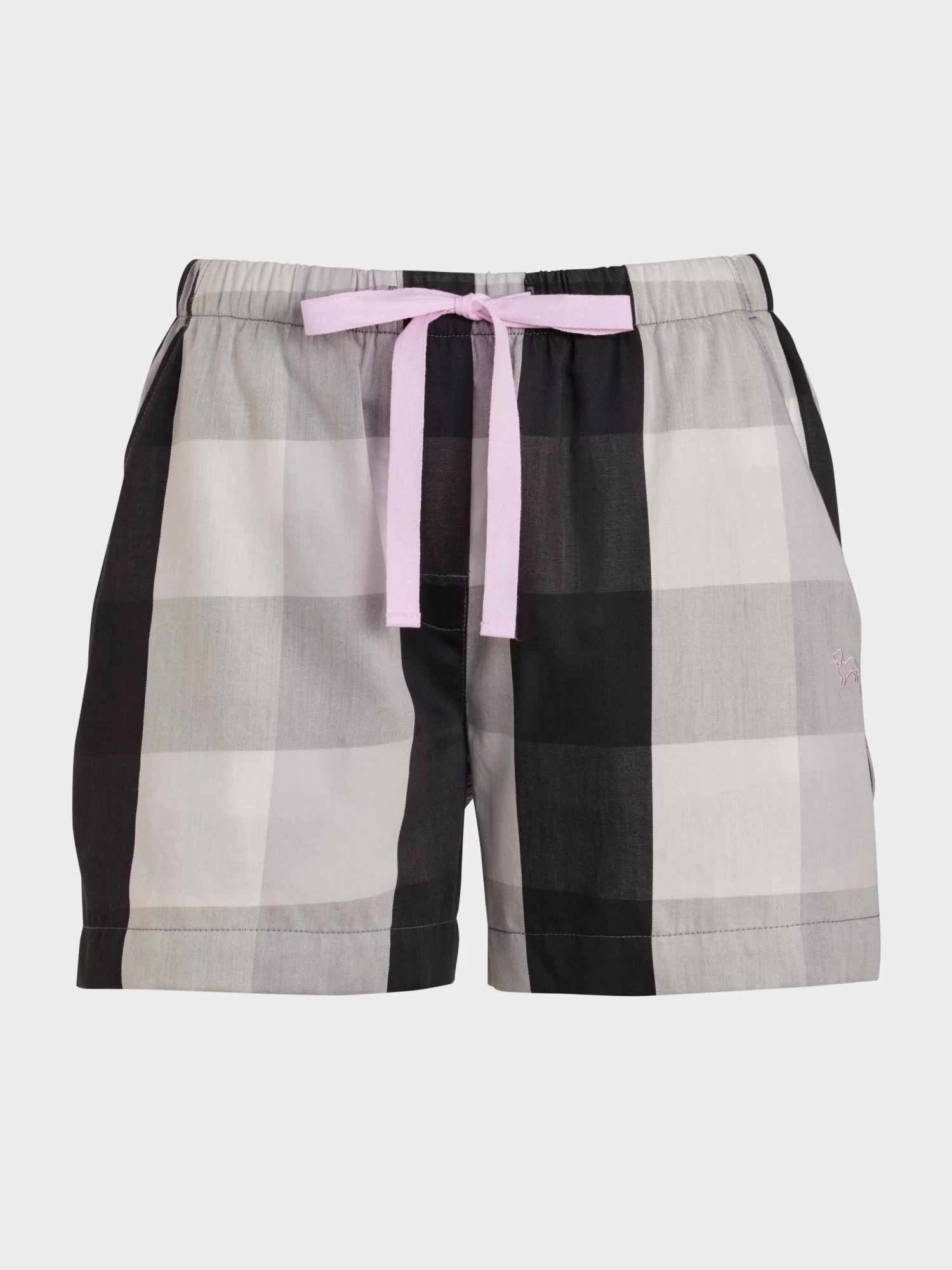 Don’t feel grey this winter! This monochrome check PJ short comes in a longer length and features pops of pink in the drawstring and embroidery.