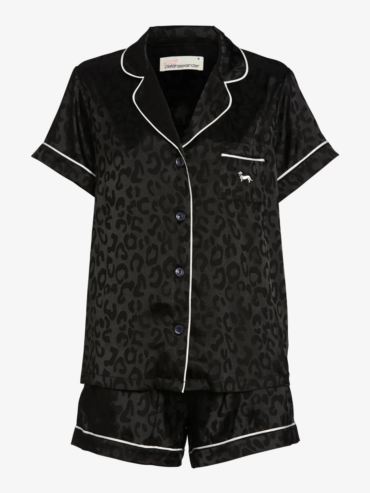 Our ever popular signature satin pyjama set has taken a wild turn. Featuring a luxurious black leopard print with white satin trim, you’ll sleep like the queen of the jungle.