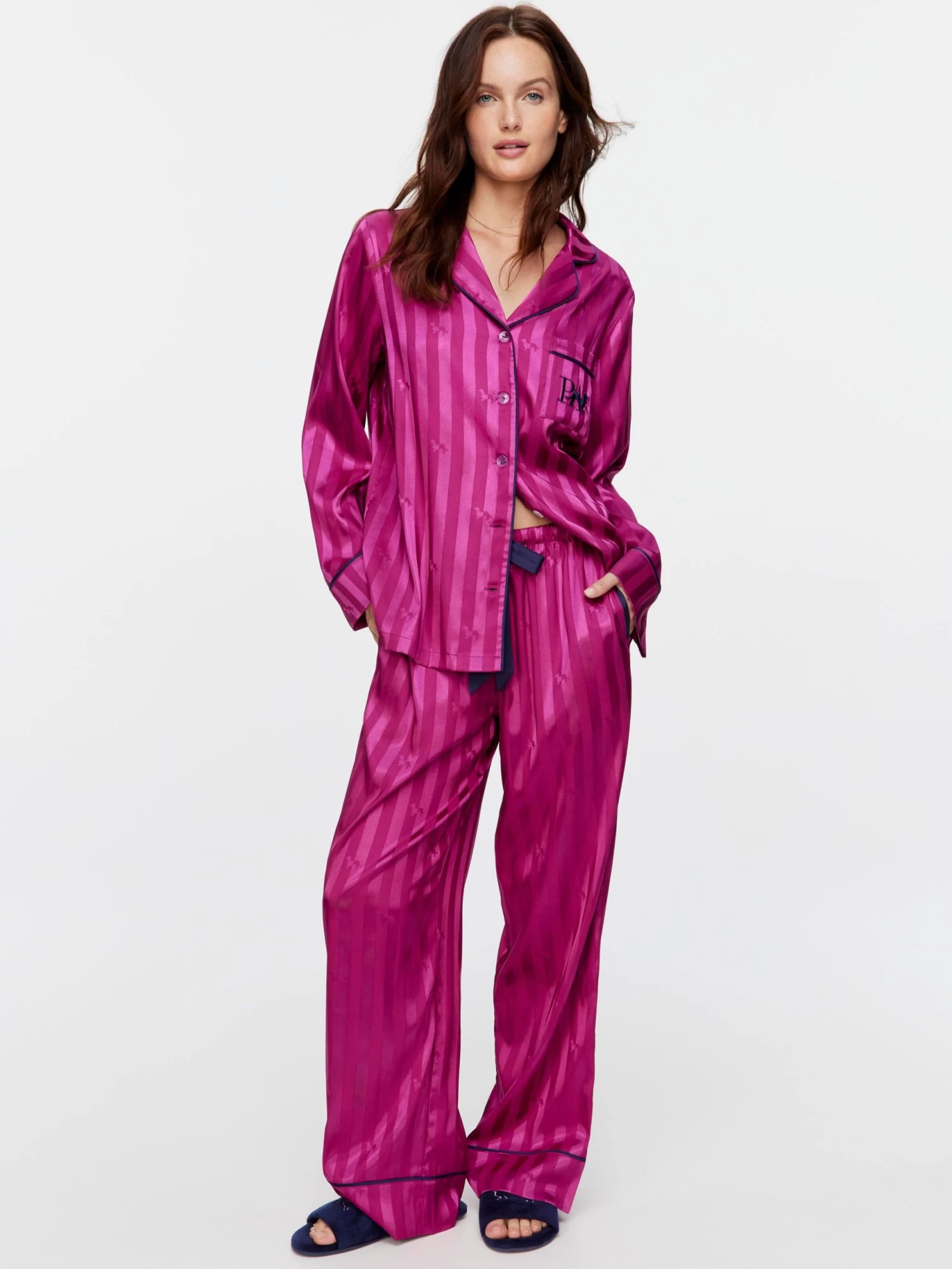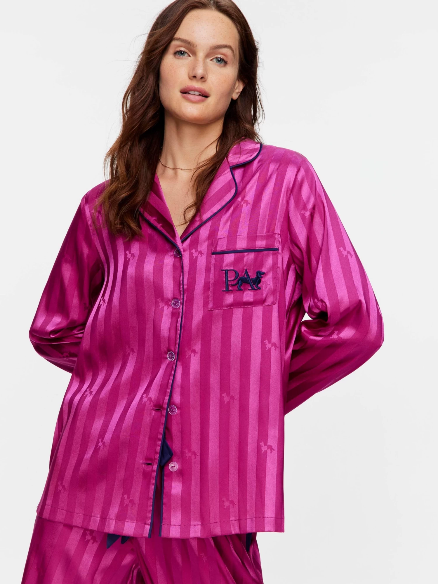 Chic, smooth and oh-so-gorgeous, our iconic striped women’s satin PJ set returns in a bold berry shade. Packaged in the classic gift box, these pyjamas are a must-have for any satin fan.