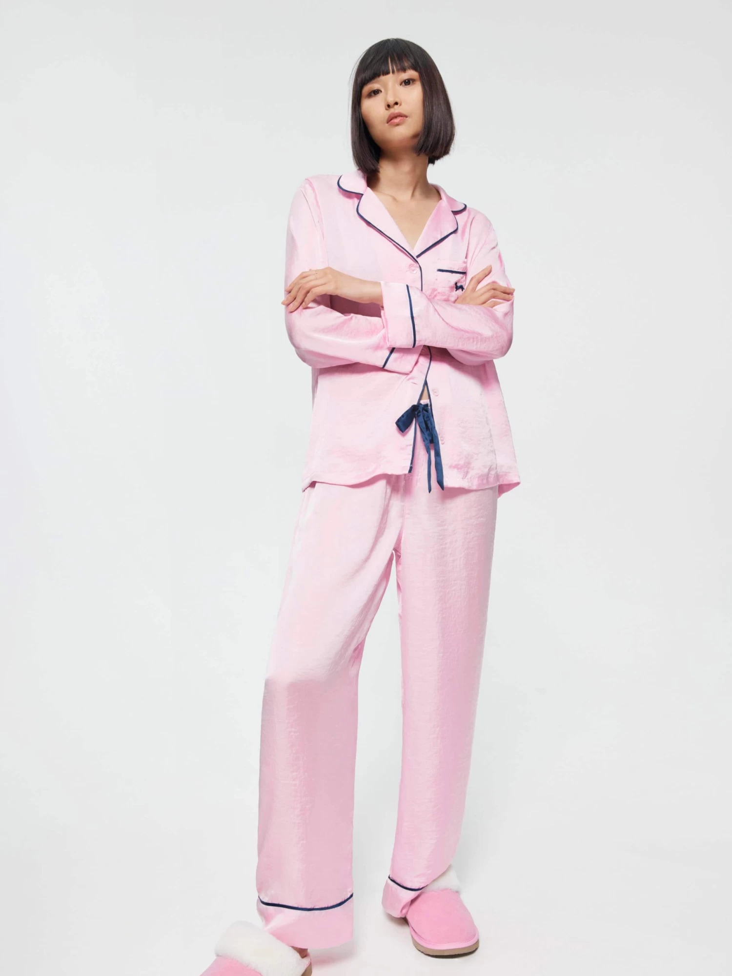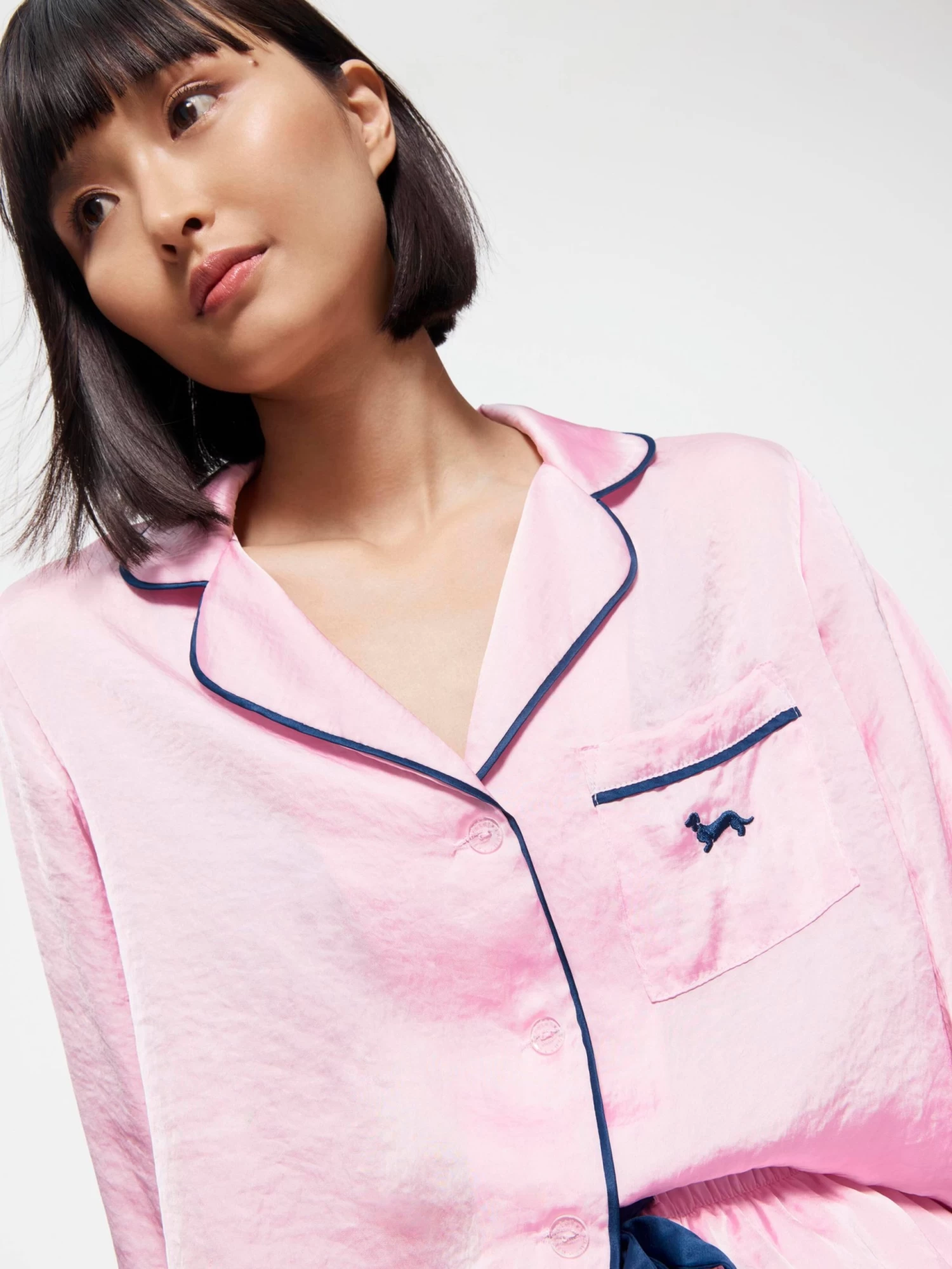 Sleep in luxury in this silky feel satin set. In a gorgeous soft pink with navy satin trim, you’ll sleep like a queen.