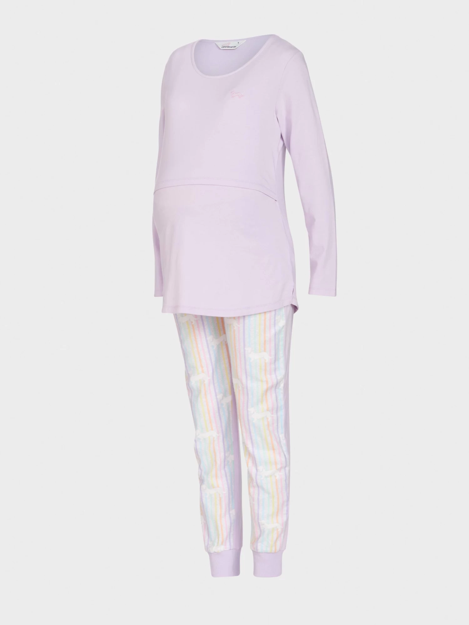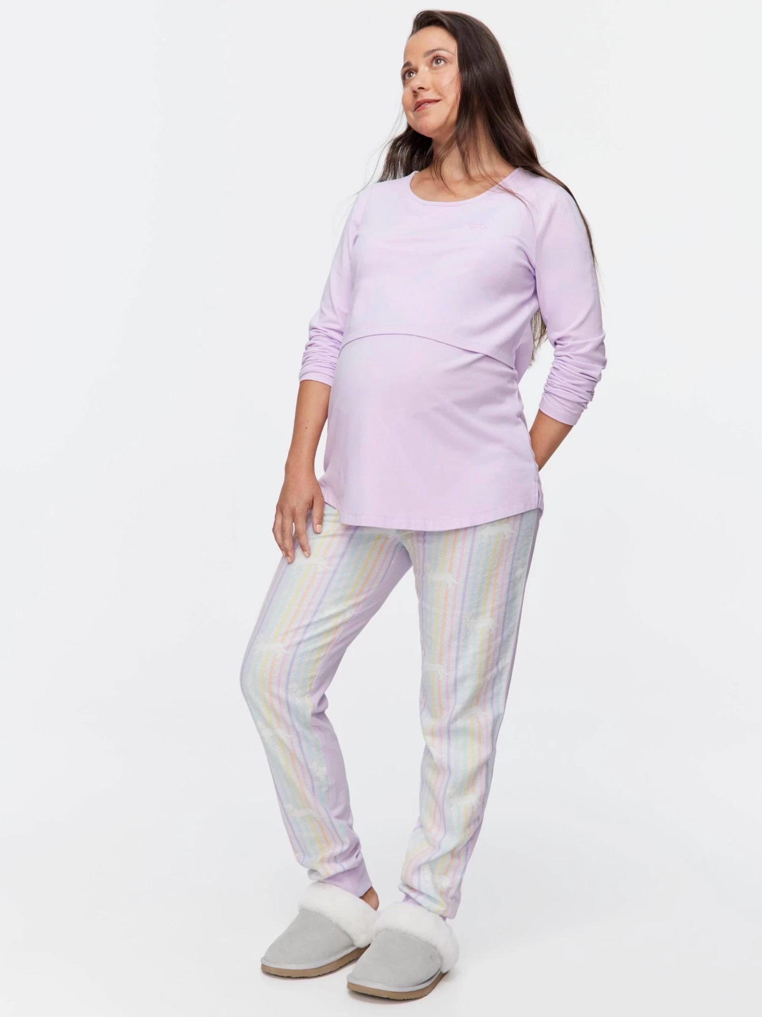 Relax during your pregnancy journey in comfort with this stunning easy access long sleeve top and matching rainbow penny cuff PJ pants, featuring a wide elasticated waistband. This lilac PJ set is perfect for lounging around while growing your bub or heading to bed on the colder nights.