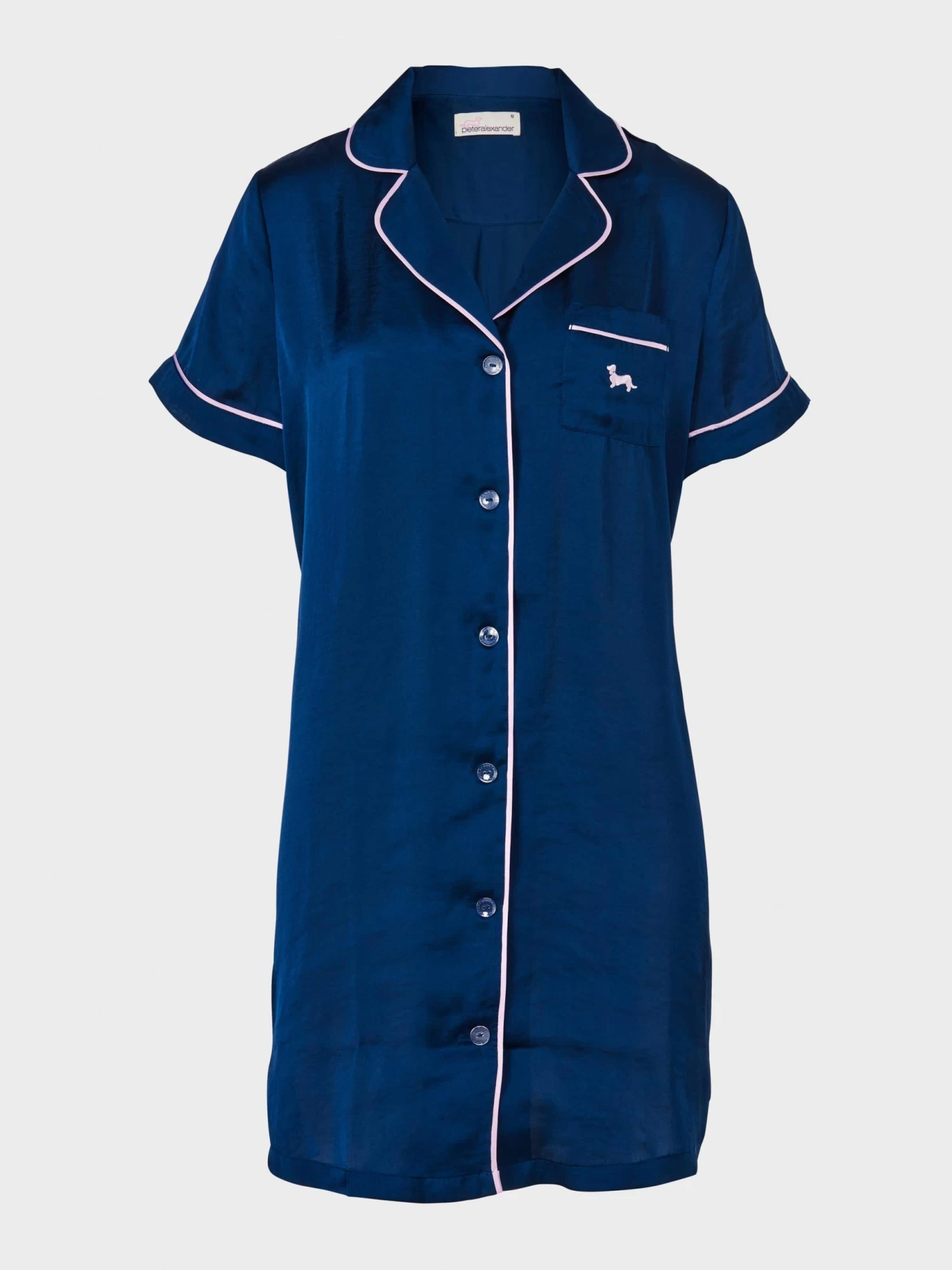 Sleep like a queen in this silky feel nightshirt. In a deep regal blue with a pink satin trim you’ll sleep in the luxury you deserve.