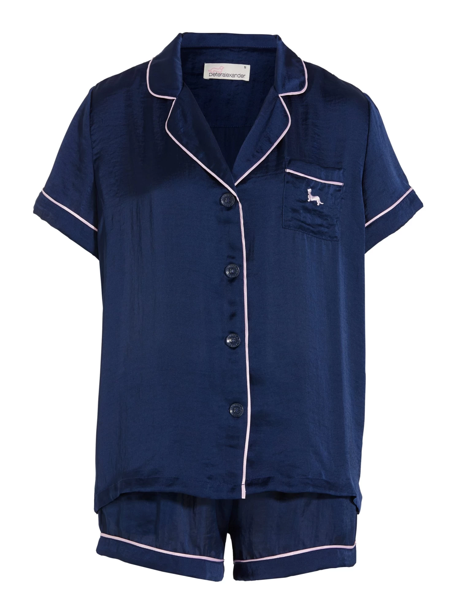 Sleep in luxury in this silky feel women’s satin pyjama set. In a deep regal blue with pink satin trim, you’ll sleep like a queen.