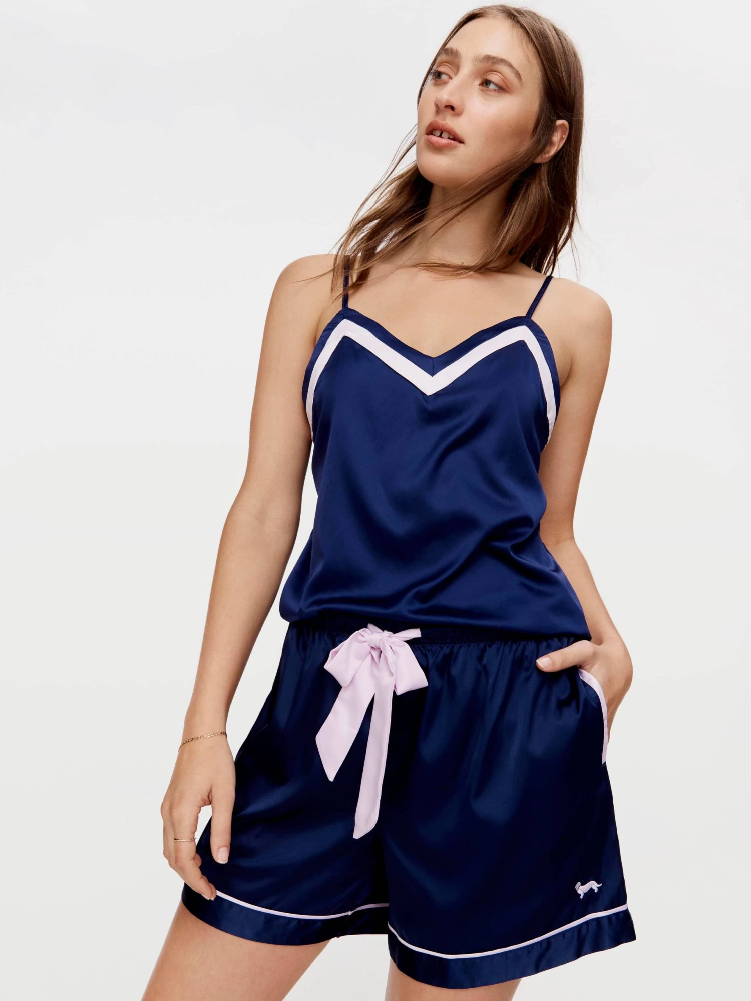Suit up in our popular tux luxe satin short, now available in a new longer length style for a little more coverage.