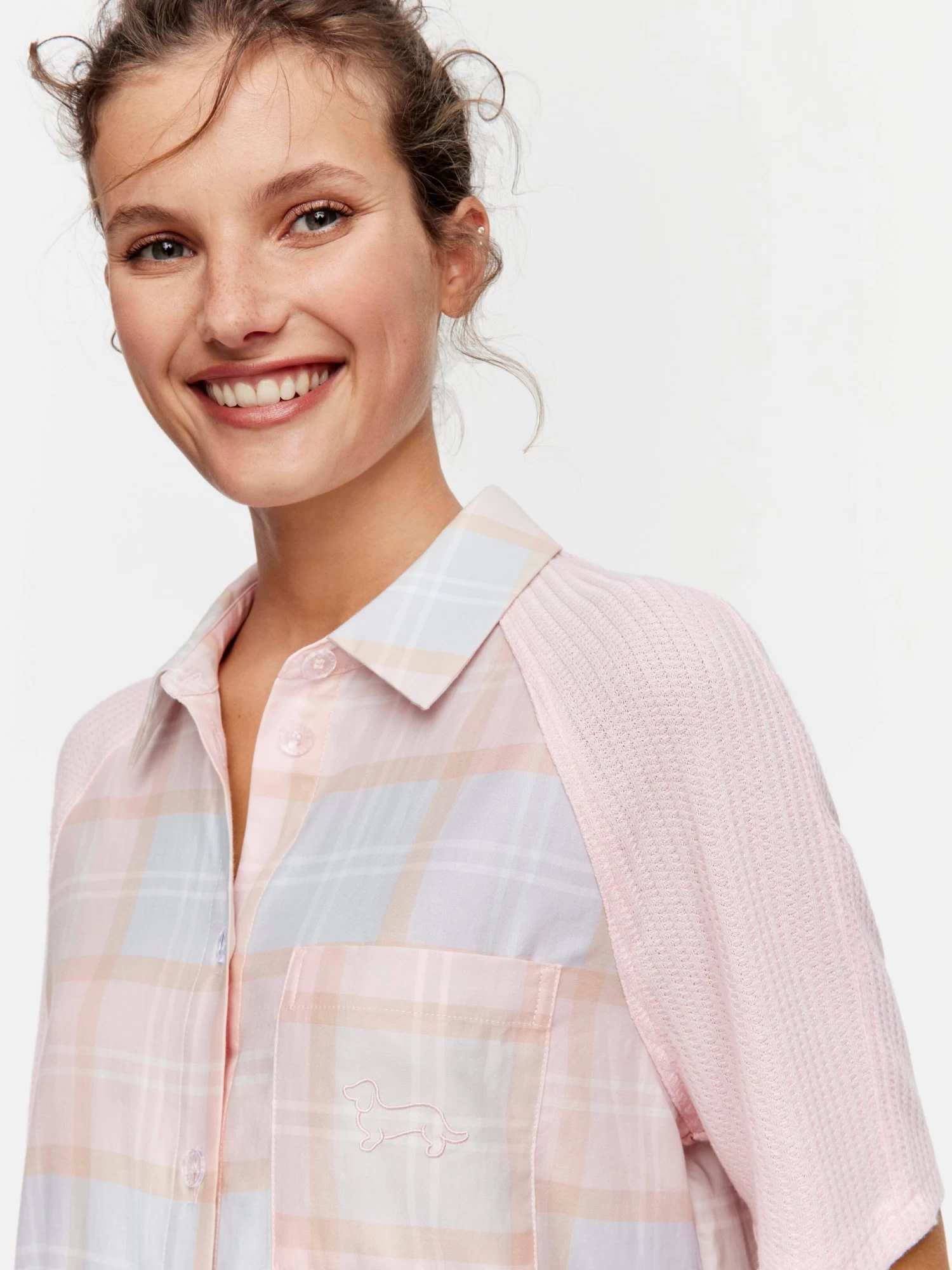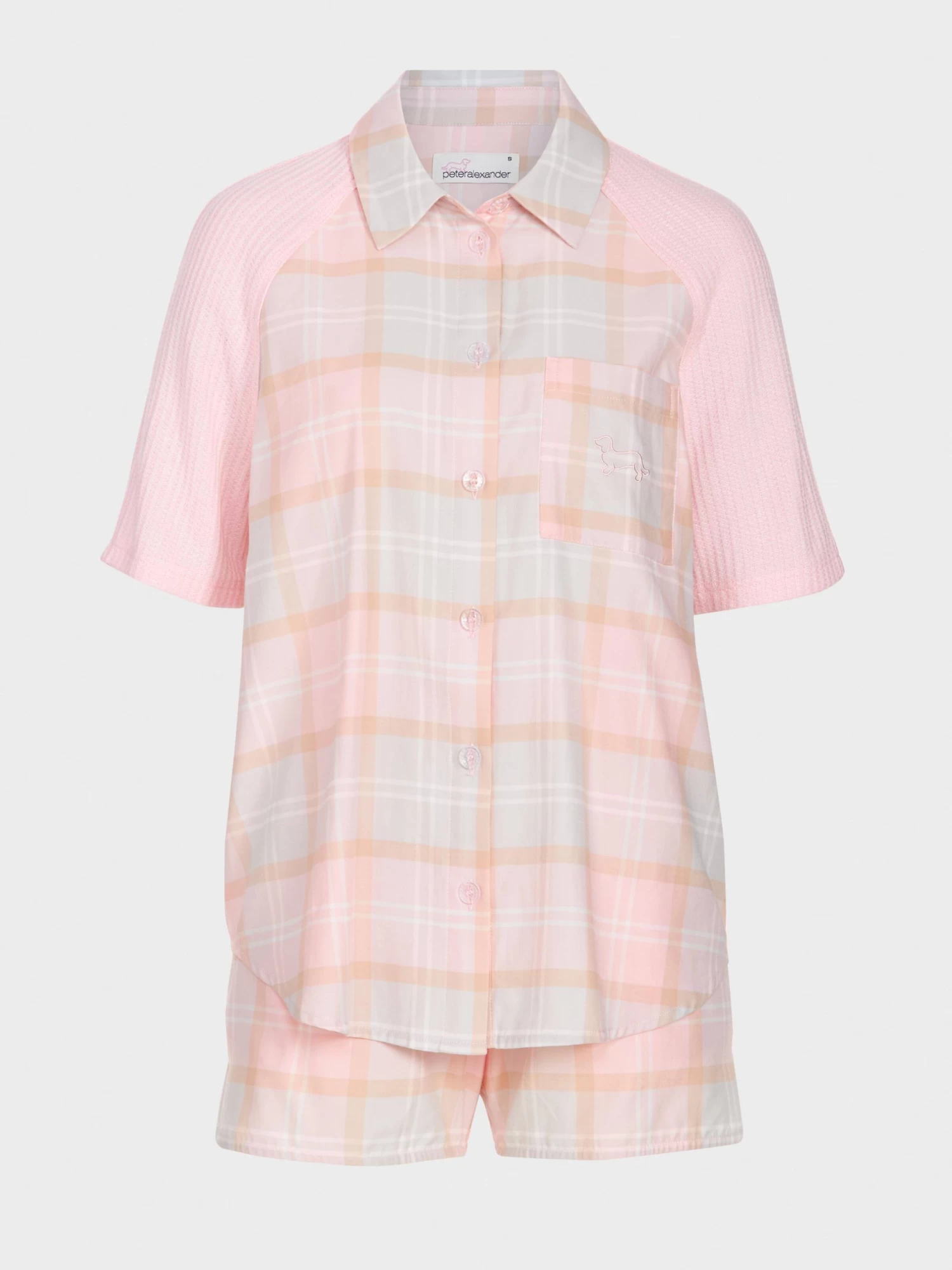 Pretty pink plaid collides with soft greys in this women’s flannelette pyjama set, featuring a long sleeve asymmetric hem button down shirt and rib cuffed PJ pants. The off-centre top pocket and contrast block colour sleeves provide an element of fun to these quirky pyjamas.