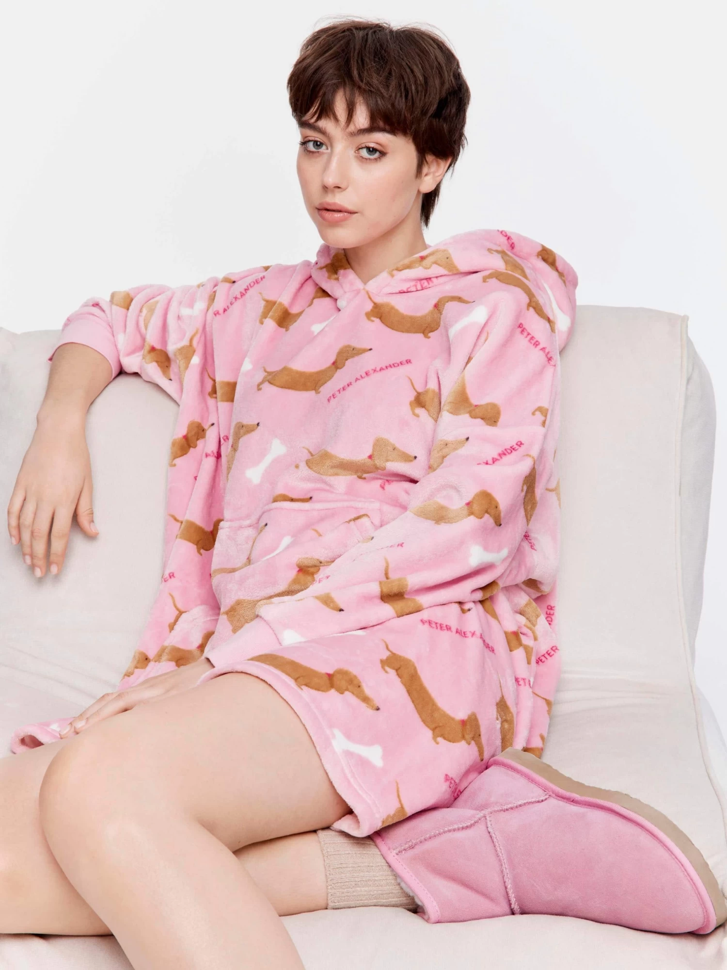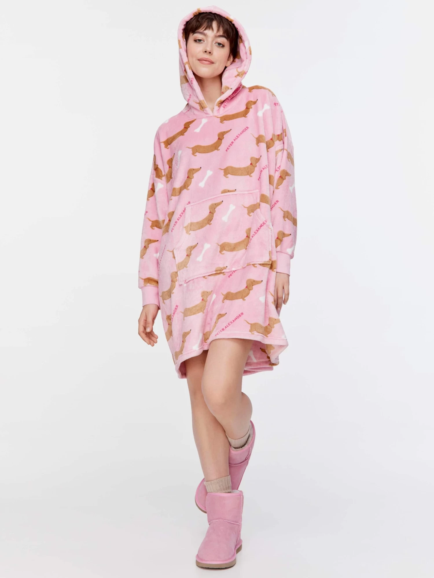 Total comfort awaits in this oversized fashion hoodie, in an all over pink penny print. This fleece cuddle shnuggle will keep you feeling toasty warm and looking adorable as ever!