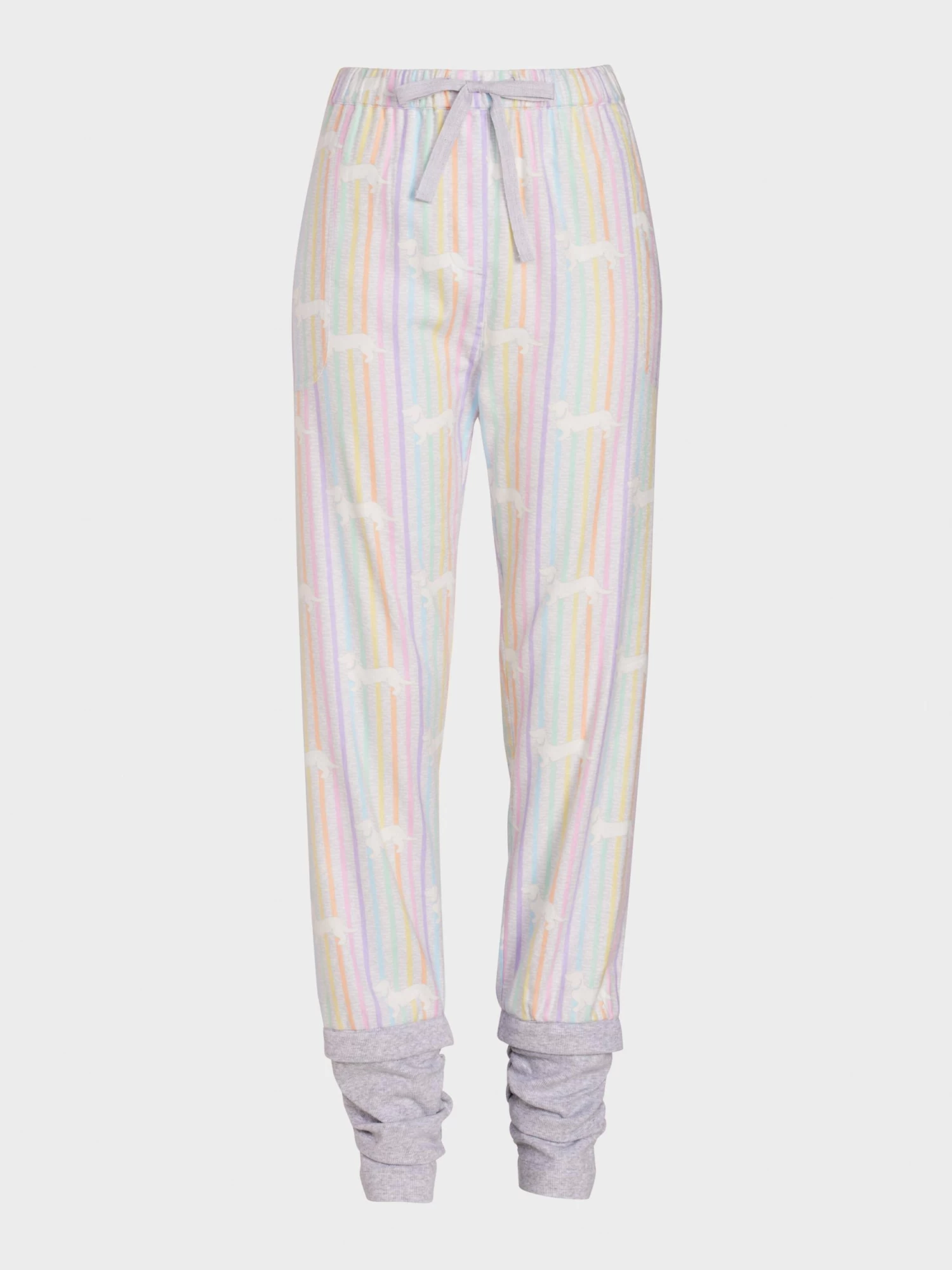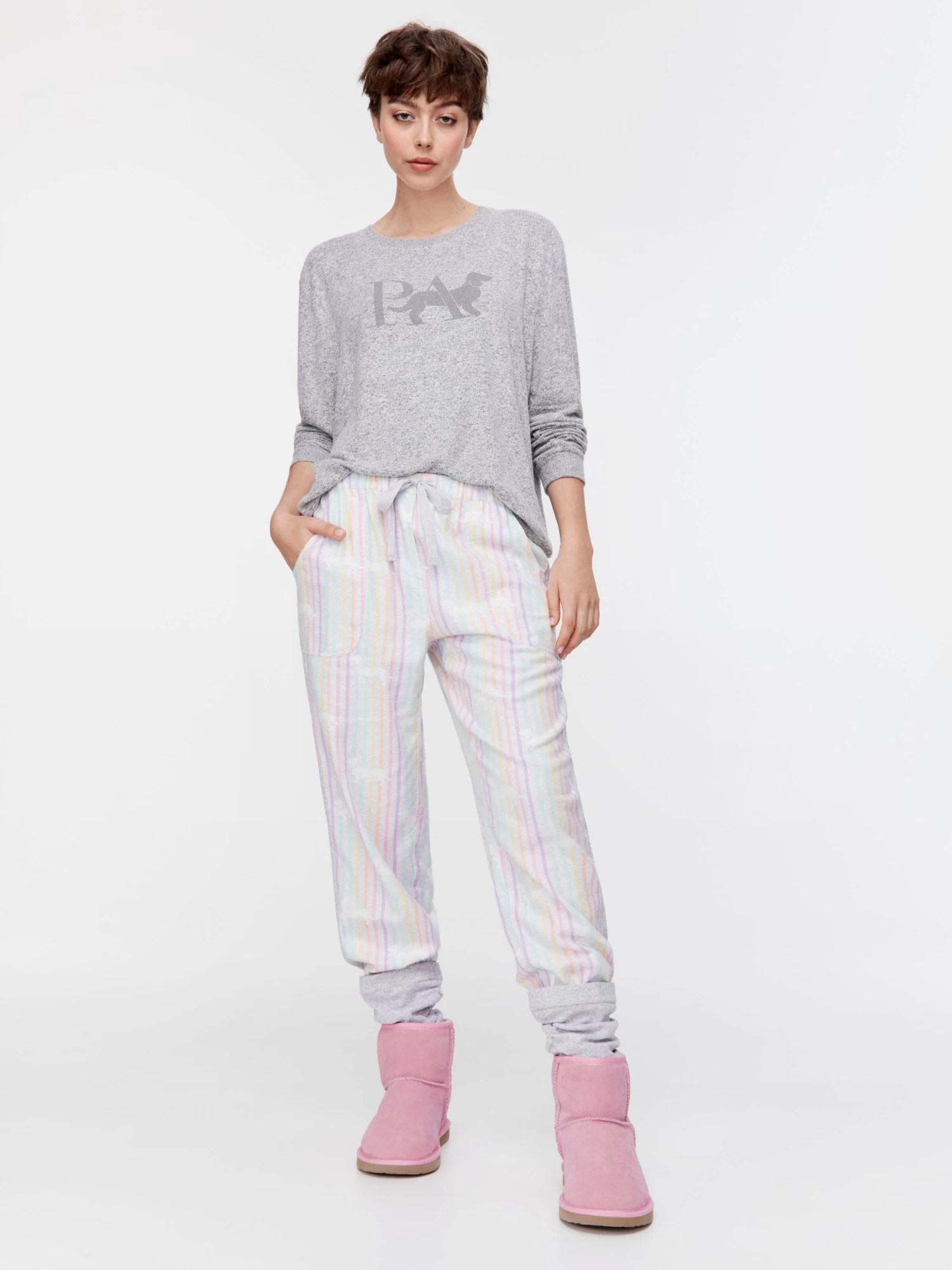 Winter is coming, and that means your favourite PJ pant style is back! Our signature legwarmer ankle cuff is here, with a rainbow stripe print featuring our penny logo and grey marle side panels.