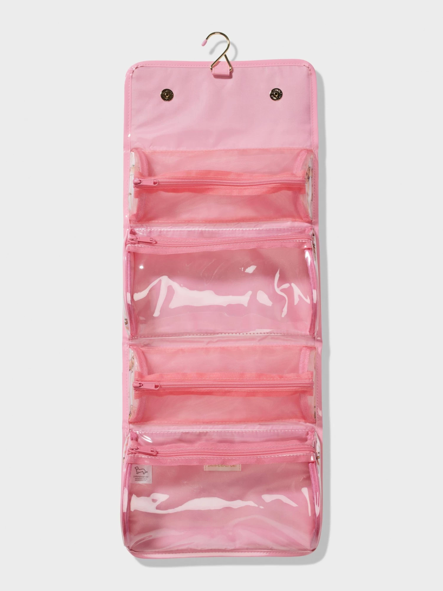 - Three separate compartments with zip closure