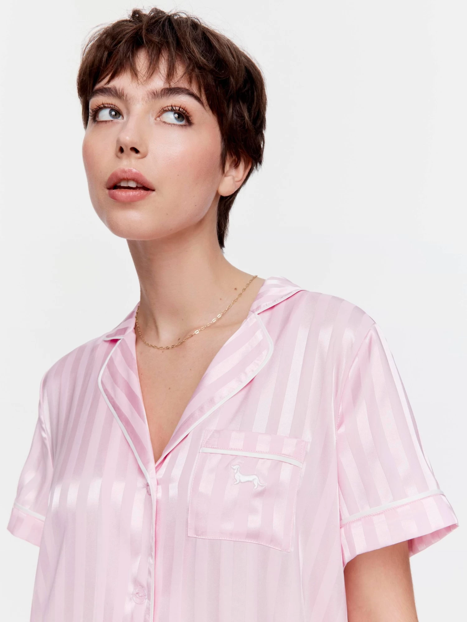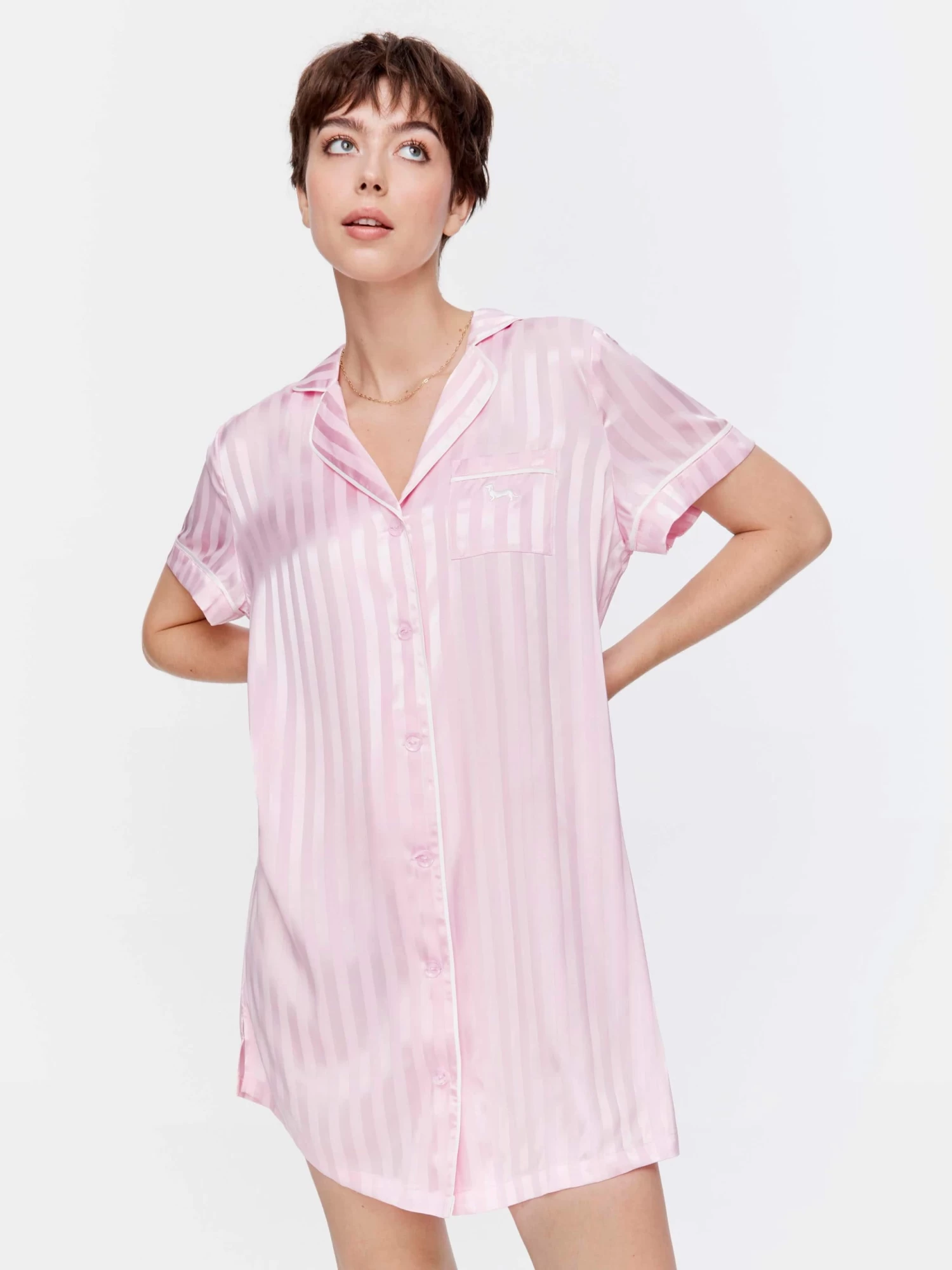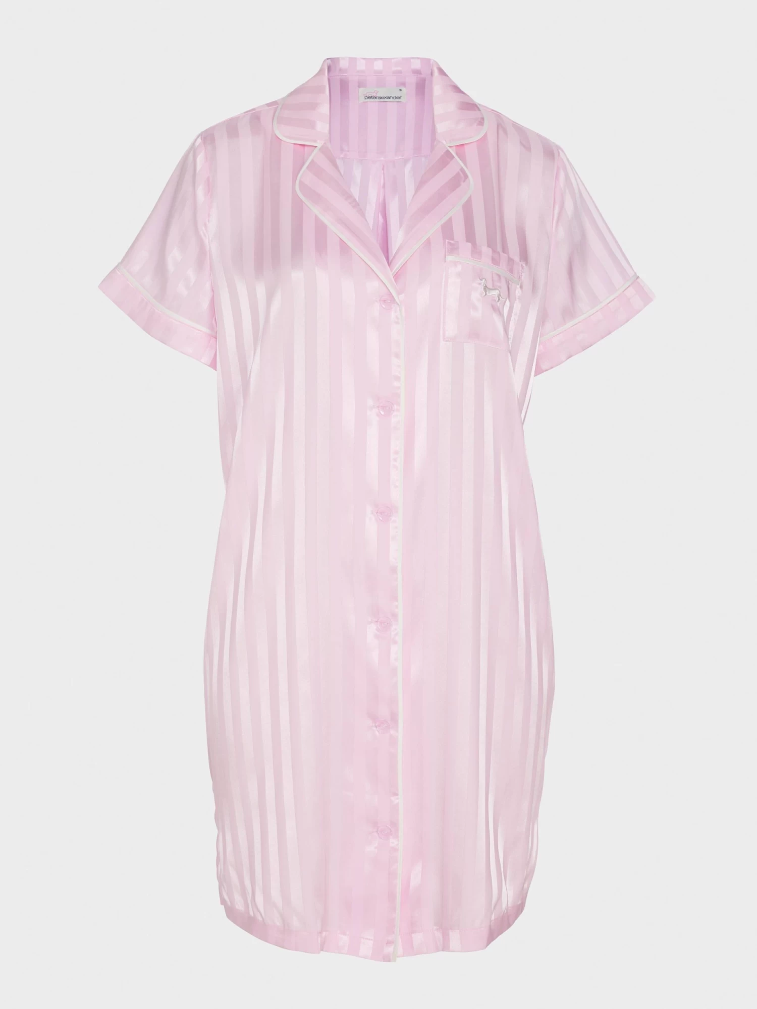 Sleep like a queen in this silky feel nightshirt. In a soft self stripe pink tone with white satin trims and penny logo embroidery, you’ll go to bed in the luxury you deserve.