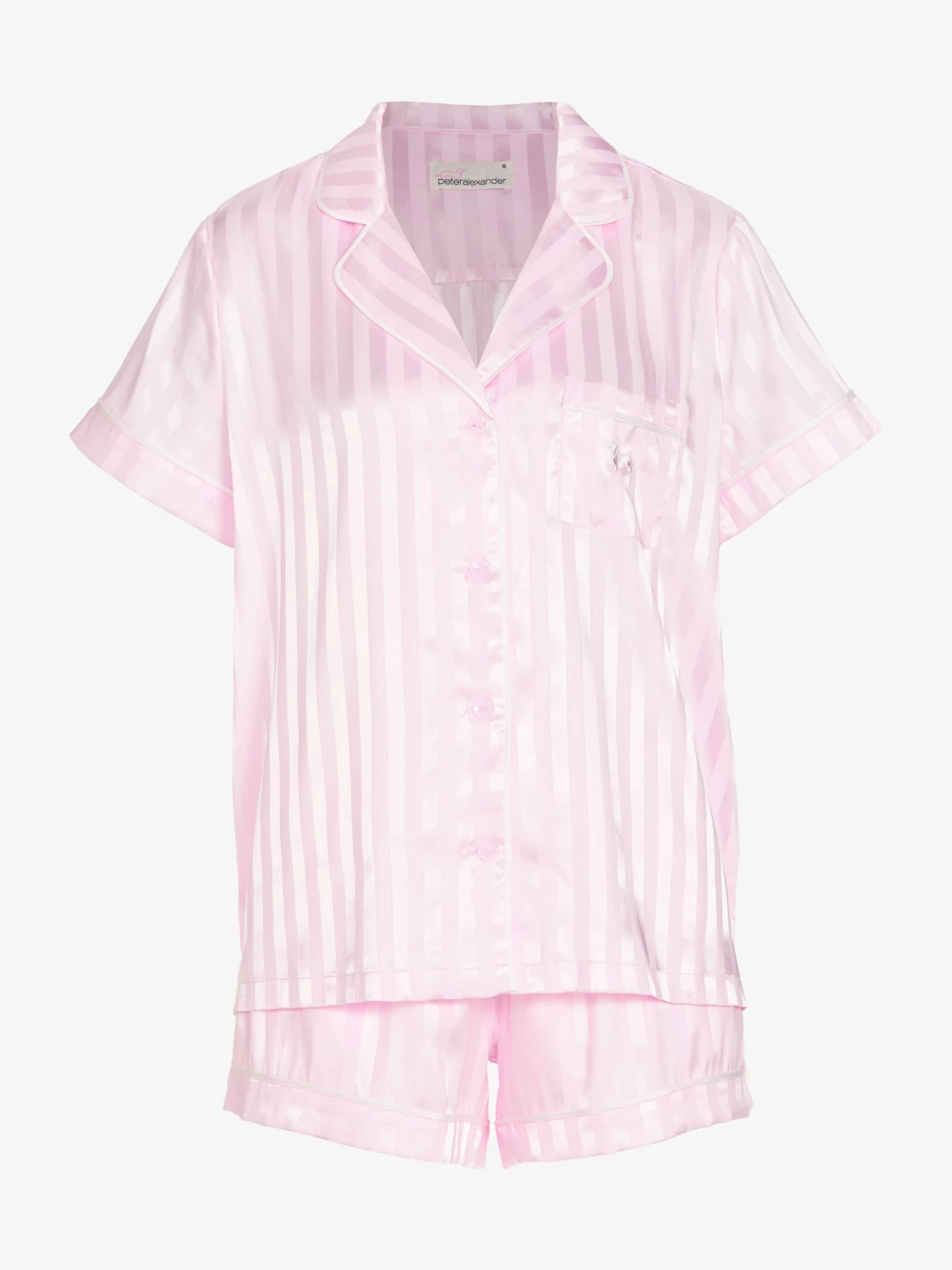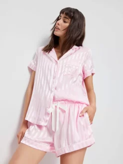Our ever popular signature style satin pyjama set for women is now available in this new pink shade that is the prettiest of pinks with a soft stripe effect.