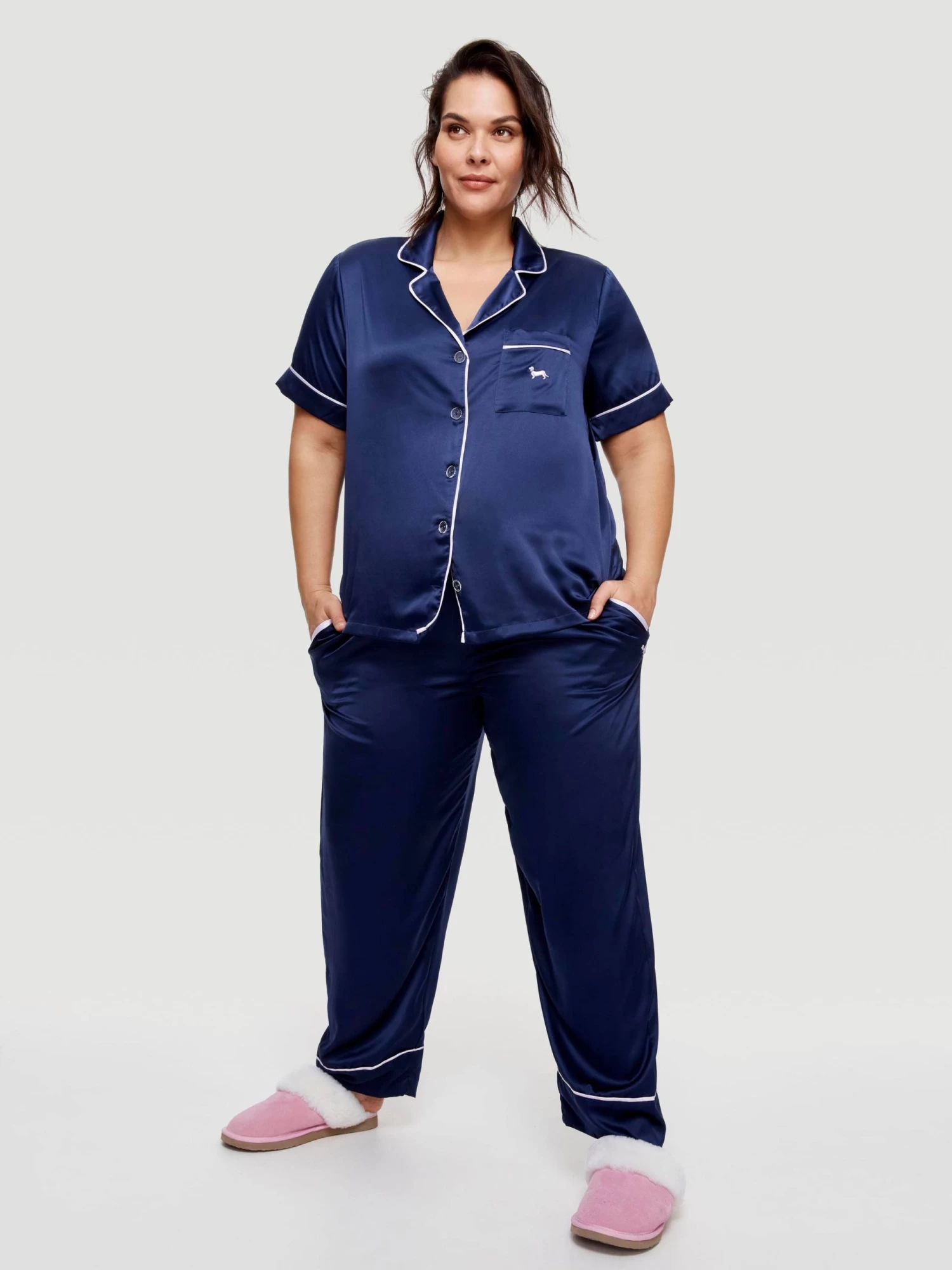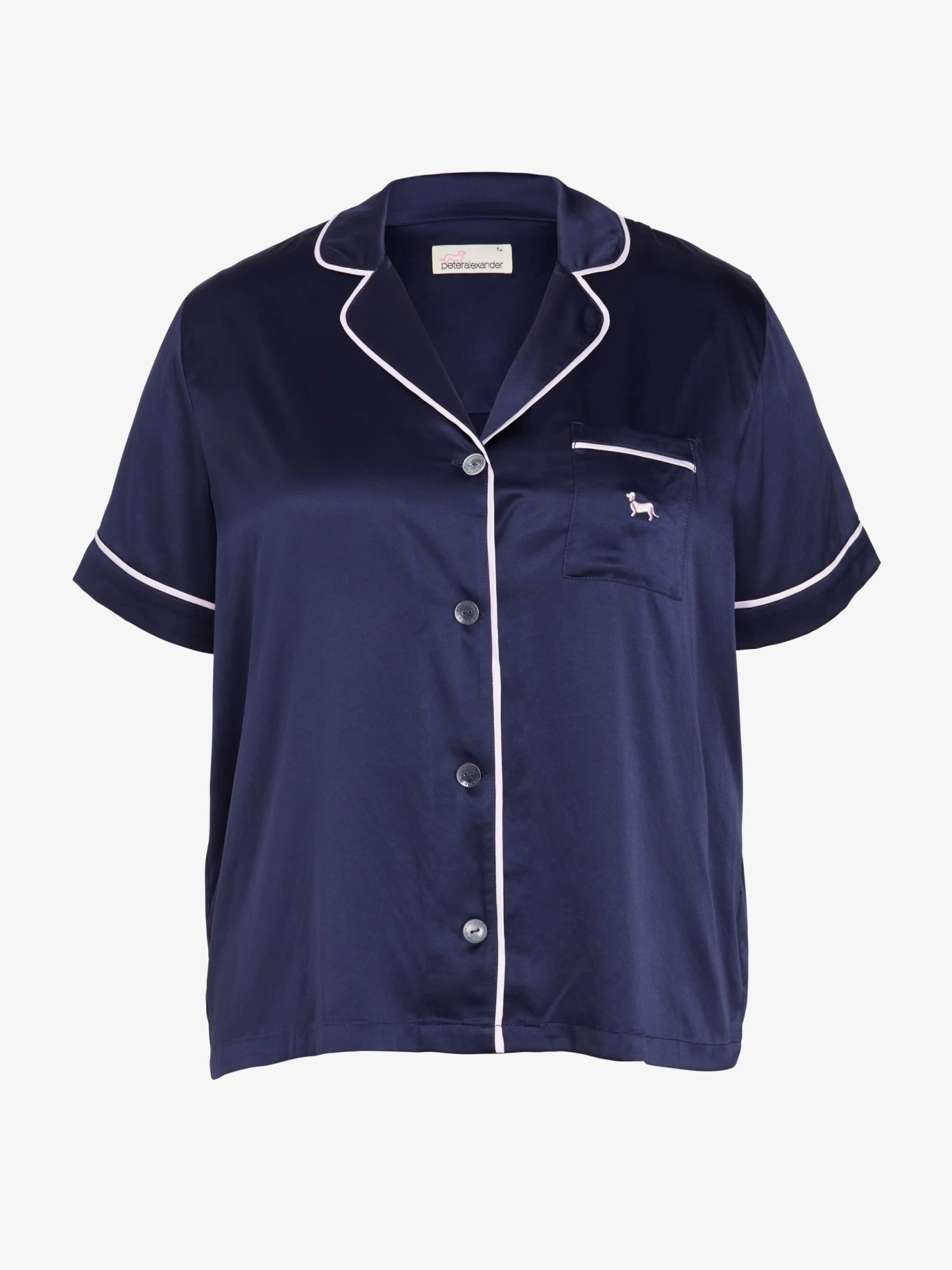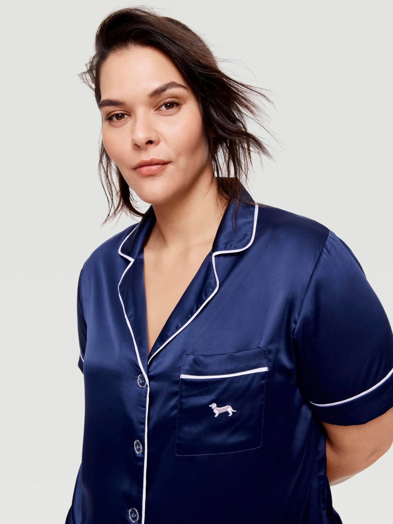 Look effortlessly stylish in this navy satin short sleeve shirt. Pair it with matching tux luxe satin pants or shorts to create a chic PJ combo to suit your style.