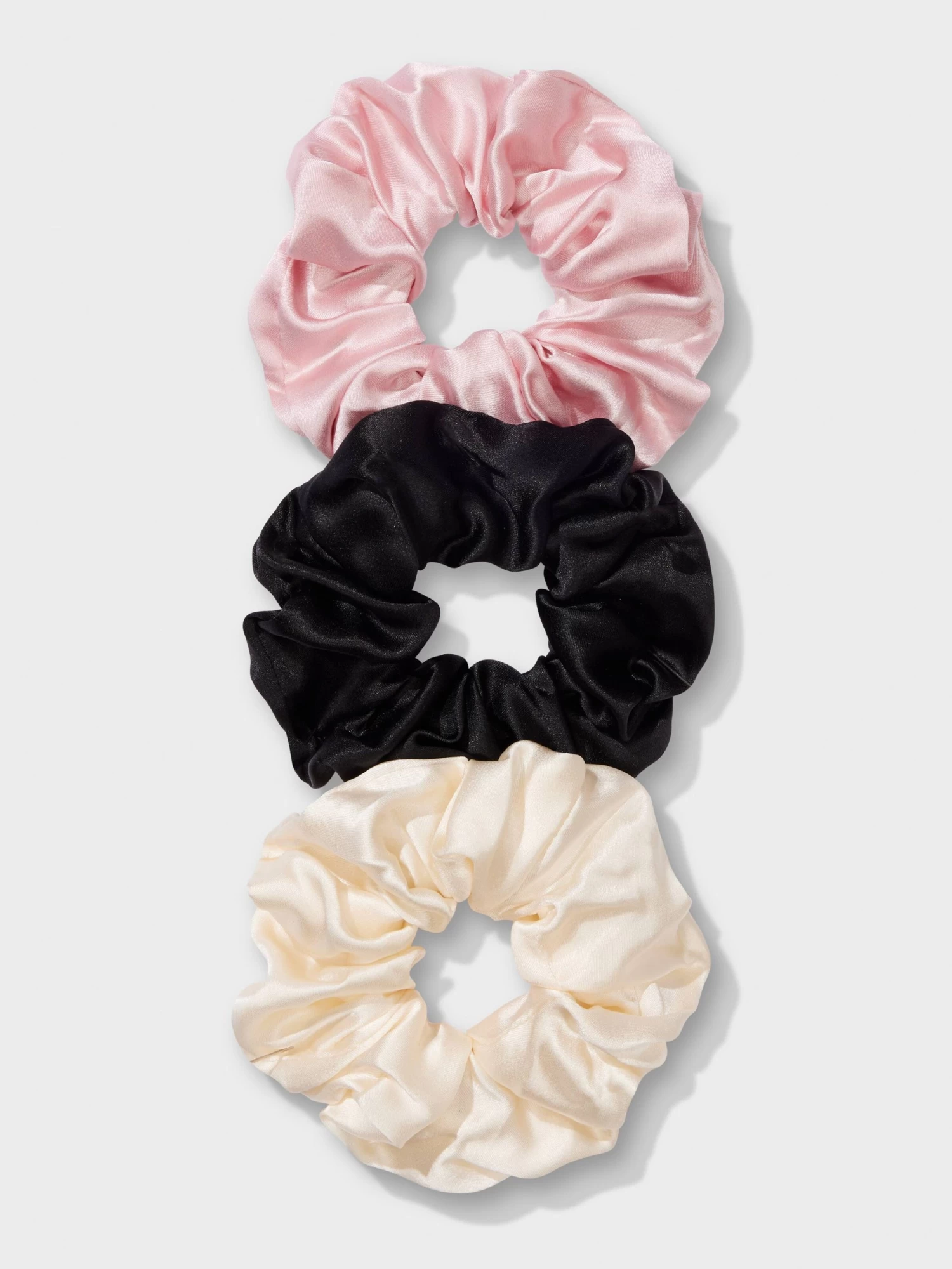 Slip on something fabulous! This pure silk scrunchie set is perfect for keeping you looking chic all day and night without causing breakage to your luscious locks! 3 stunning coloured scrunchies, in black, snow white & classic P.A. pink, are packed into a gift box to make them the perfect stocking stuffer