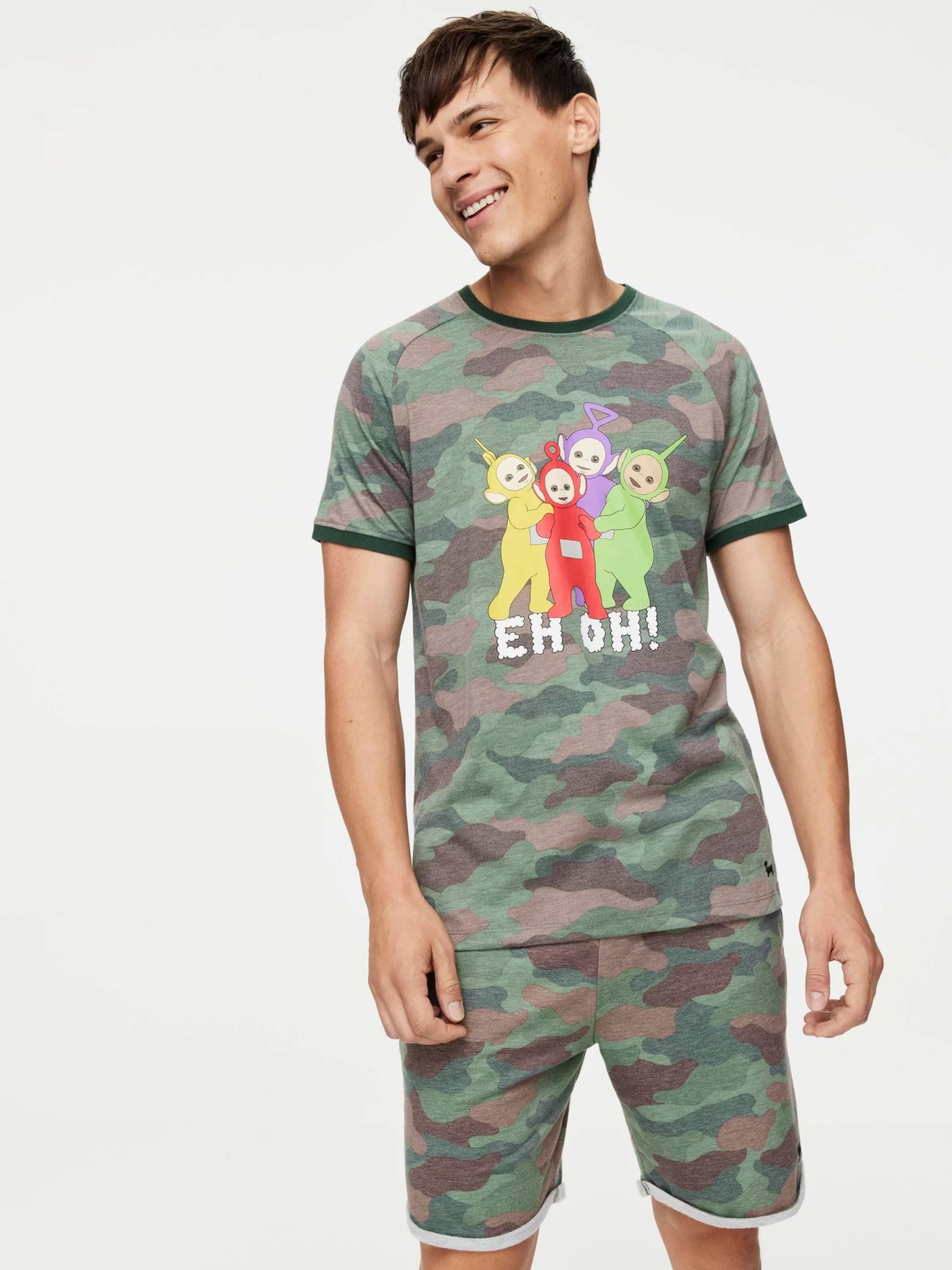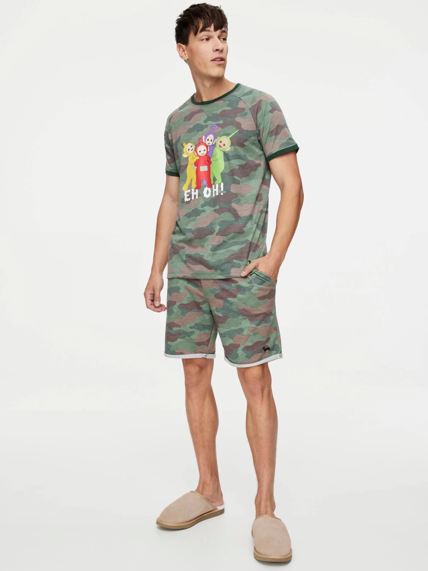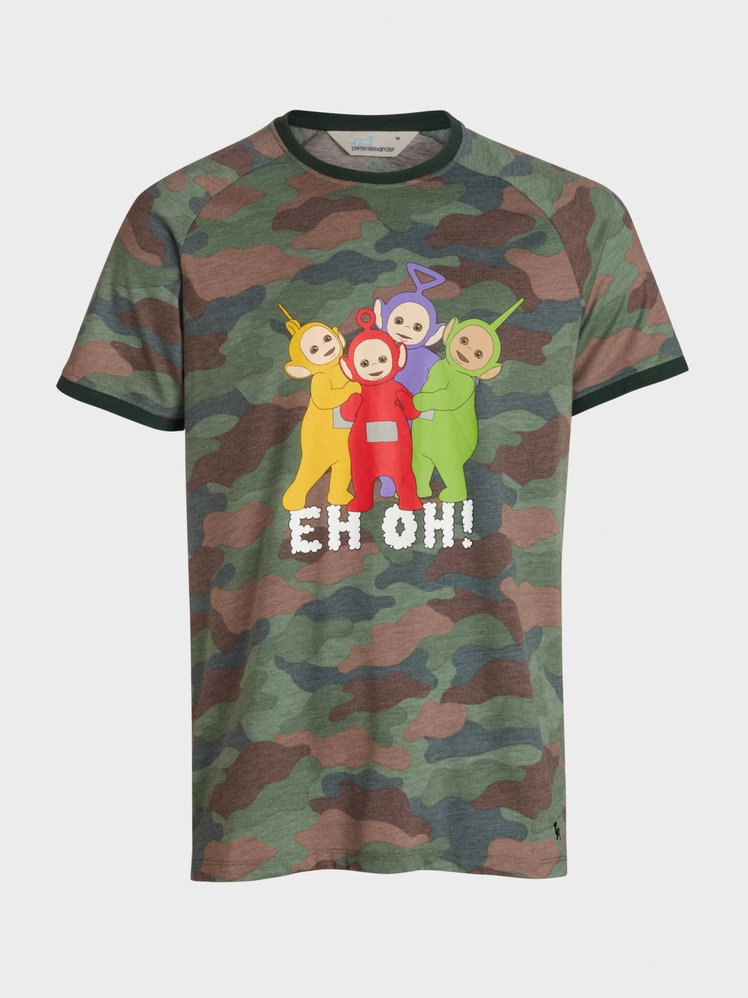 Head to bed with your fave Teletubbies! Featuring Tinky Winky, Dipsy, Laa-Laa, Po this men’s tee has an all over camo print. Pair it with the matching bottoms for the perfect PJ combo.